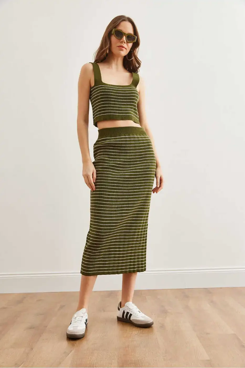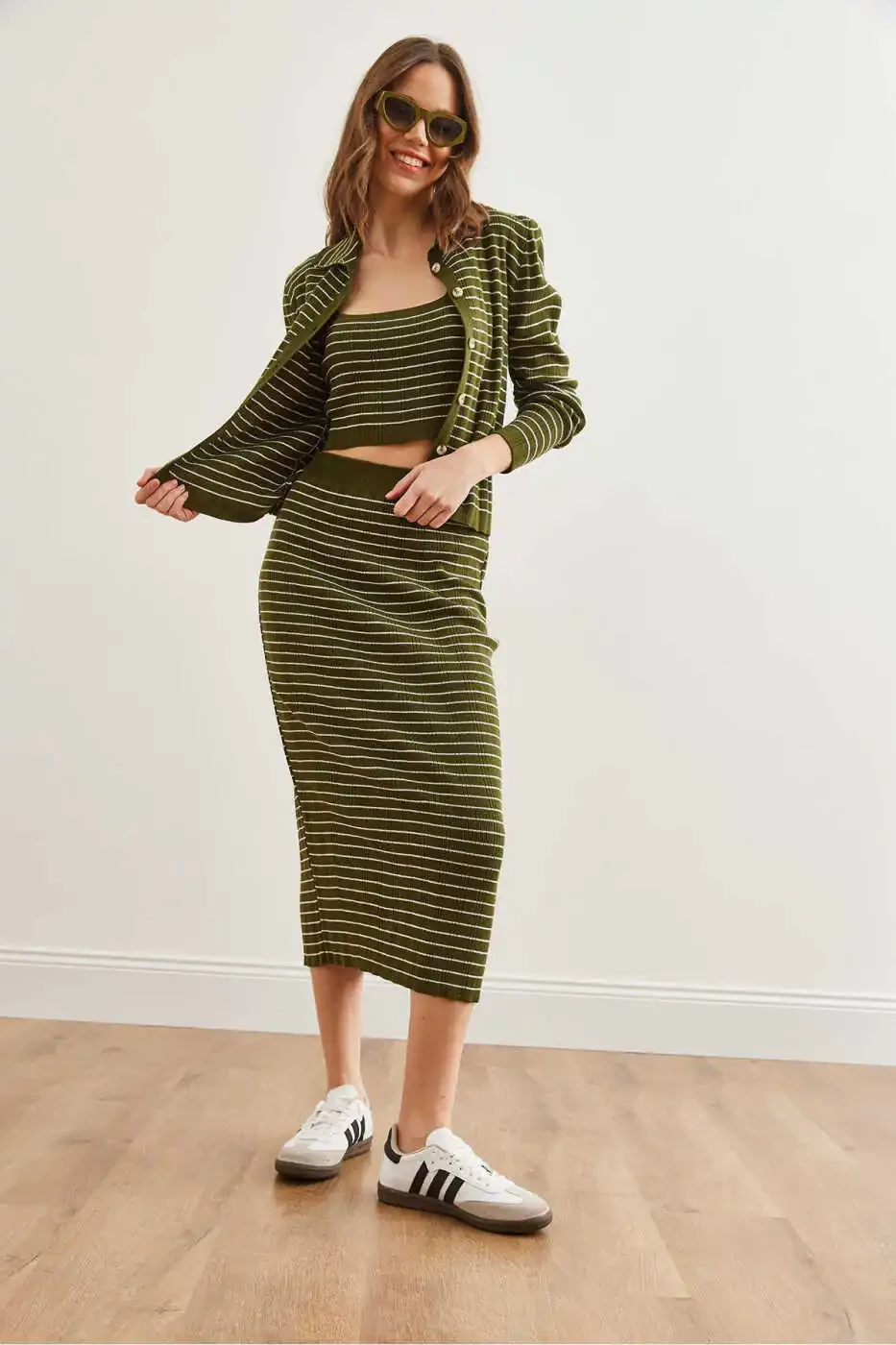 Ushbu zamonaviy va qulay 3 qismli Triko to'plami sizning maxsus kunlaringiz uchun ajoyib tanlovdir. 100% akrildan tayyorlangan to'plam yumshoq va elastik strukturaga ega. To'plamda chiziqli bluzka, bel qismiga o'tirgan yubka va zamonaviy kardigan mavjud.