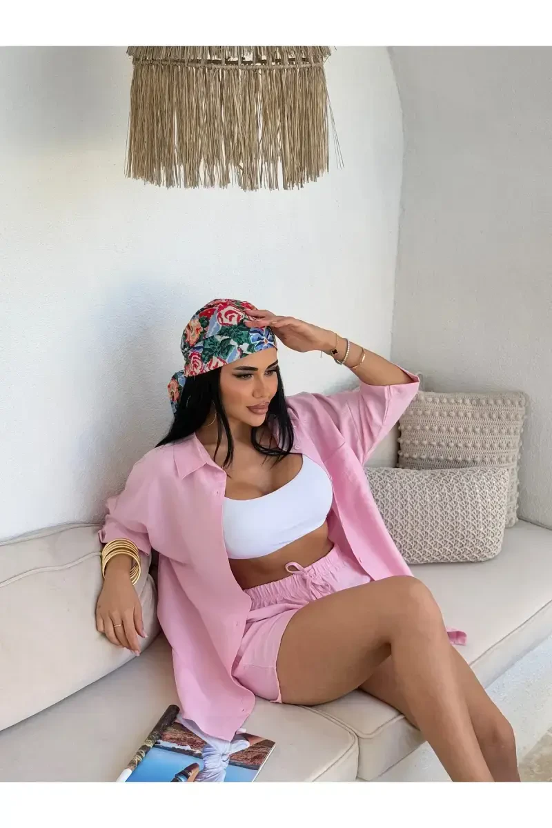 Keten Oversize Ko'ylak Short Komplekti | Ayollar Yozgi Kombini