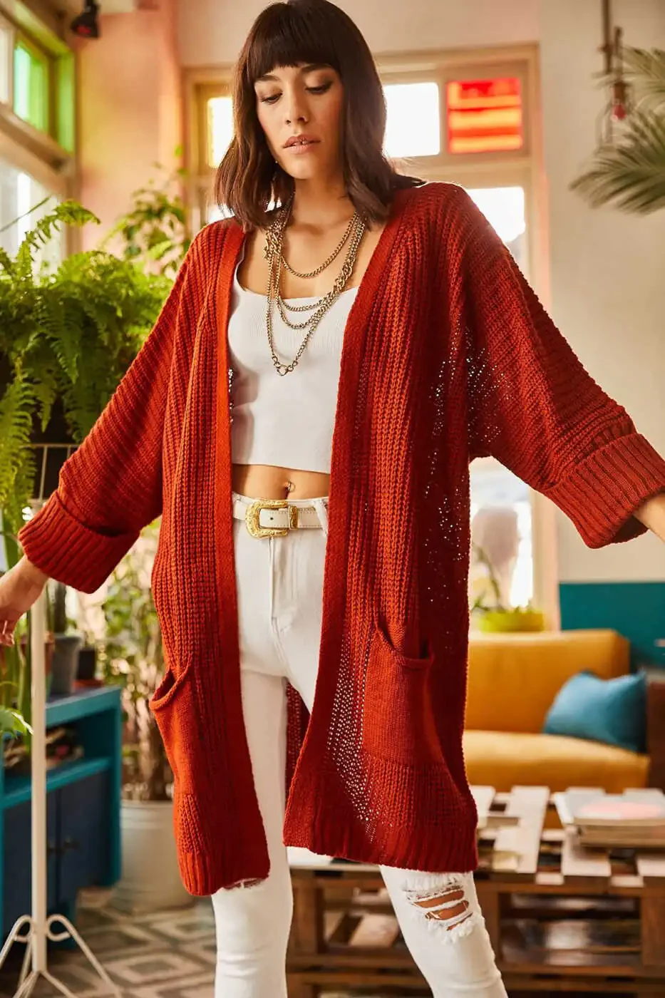 Ayollar uchun g'isht tusli yengi burmali chokli keng triko kardigan HRK-19000123