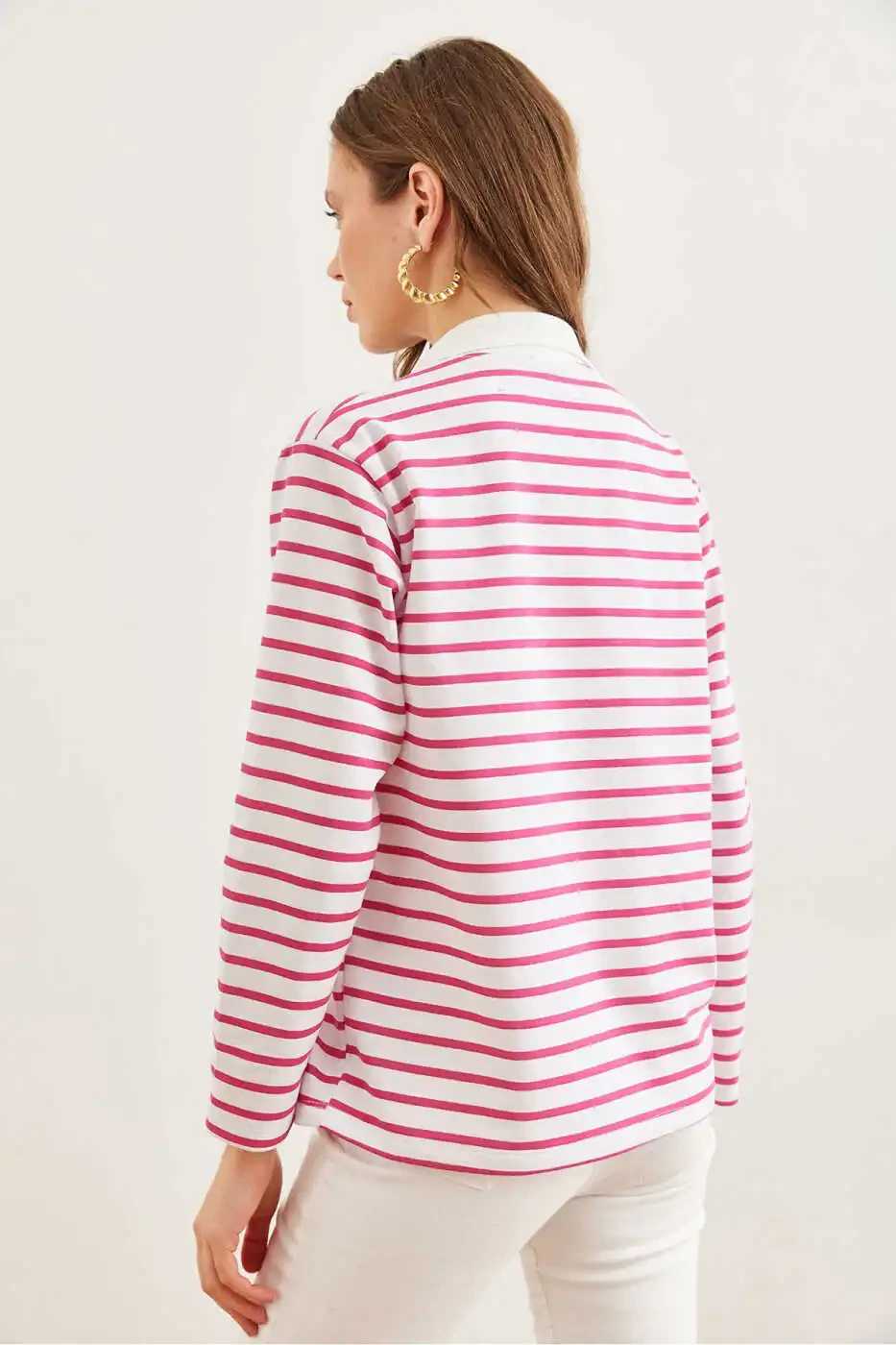 Ayollar uchun pushti rangdagi polo yoqali chiziqli futbolka: uslub va qulaylikning uchrashgan joyi