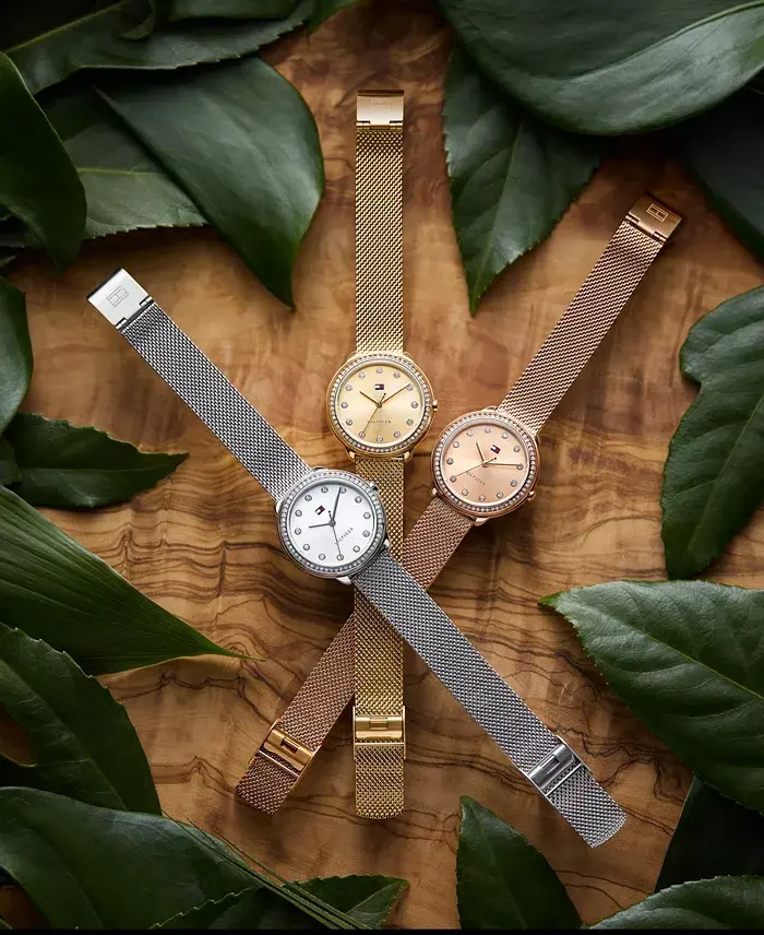 This petite and pretty timepiece will add a touch of everyday glamour to your look. Silver-tone stainless steel mesh bracelet. Round silver-tone case, 32mm. Silver-tone dial with stick markers. Quartz movement.