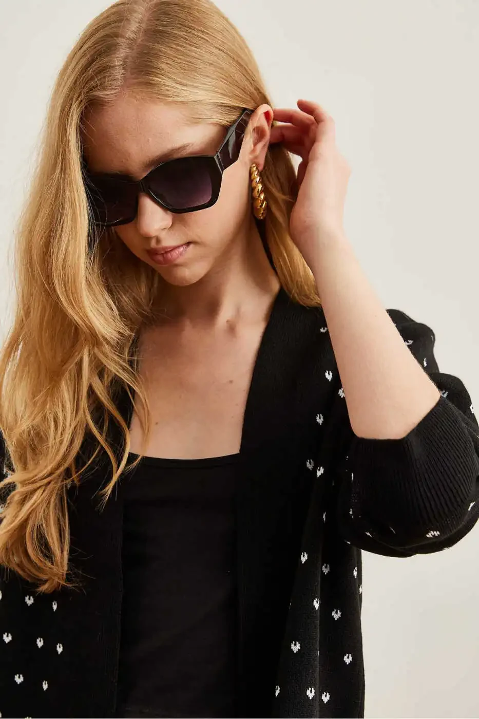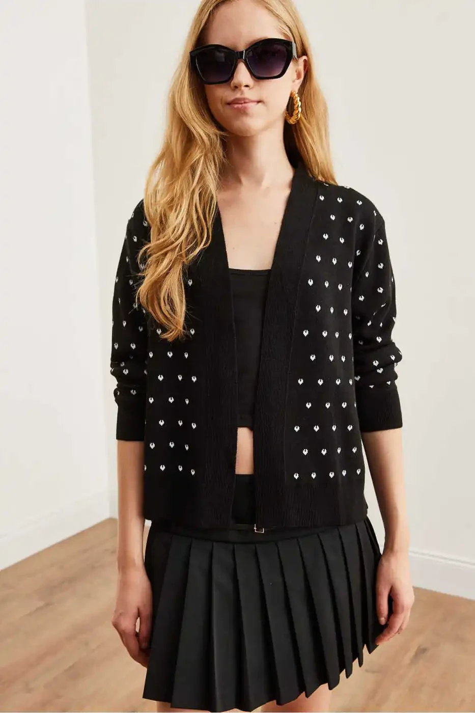 Ayollar uchun triko kardigan, qalin bantli triko kardigan, qora triko kardigan, yurak detalli triko kardigan, qulay triko kardigan