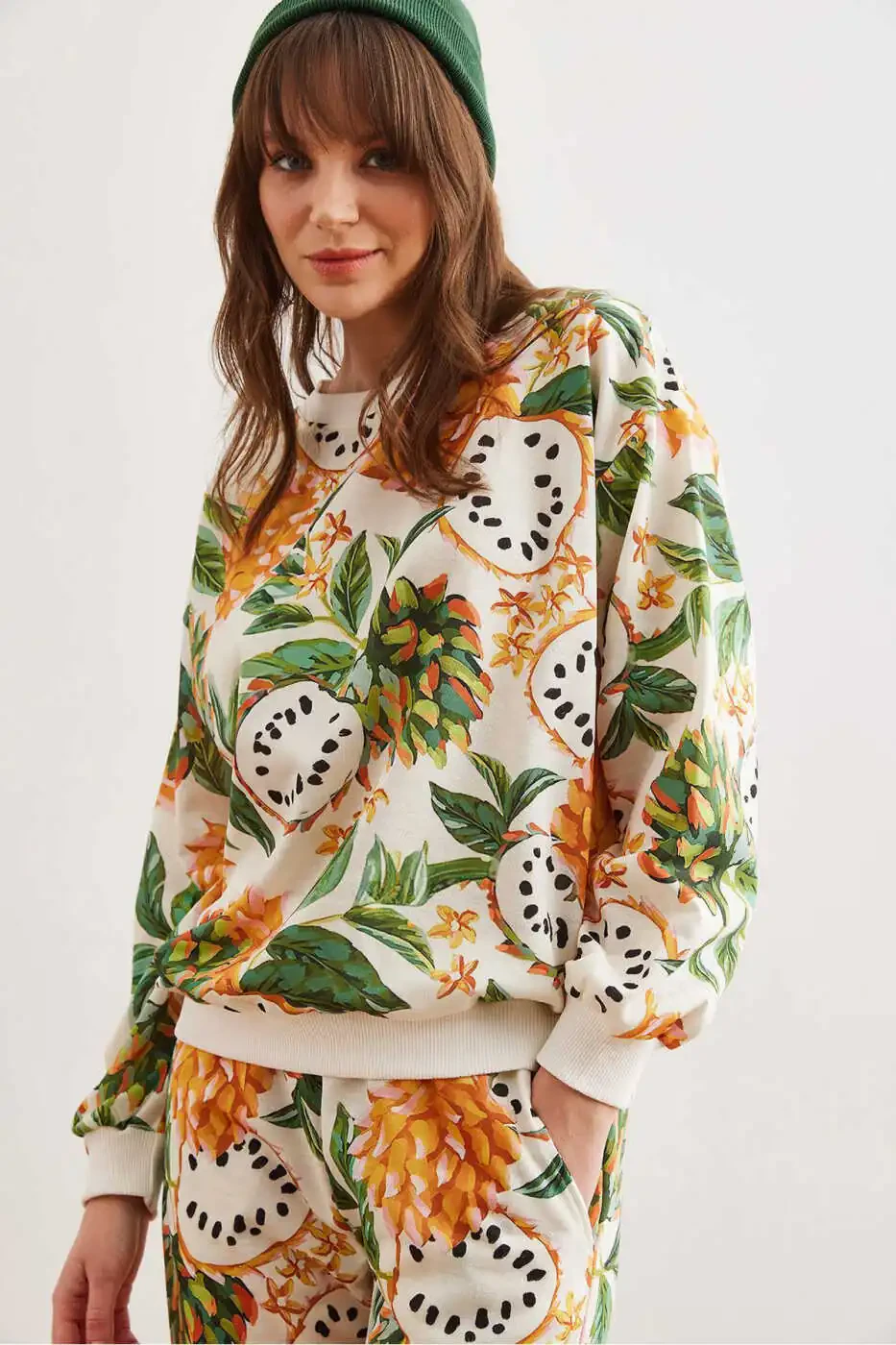 ayollar svitshoti, tropik naqshli svitshot, ekru svitshot, qulay svitshot, yumshoq tuqimali svitshot, xalta svitshot
