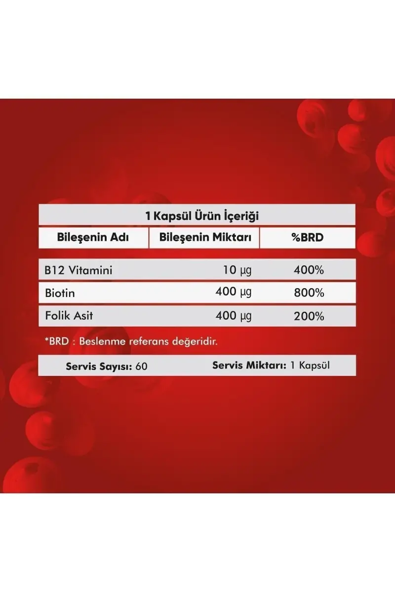 B12 vitamini, biotin, folik kislotasi, teri salomatligi, soch salomatligi, tirnoq salomatligi, miya salomatligi, energiya, charchoq, zaiflik, immunitet tizimi, hujayra bo'linishi, o'simlik kapsulası, tabiiy tarkibiy qismlar