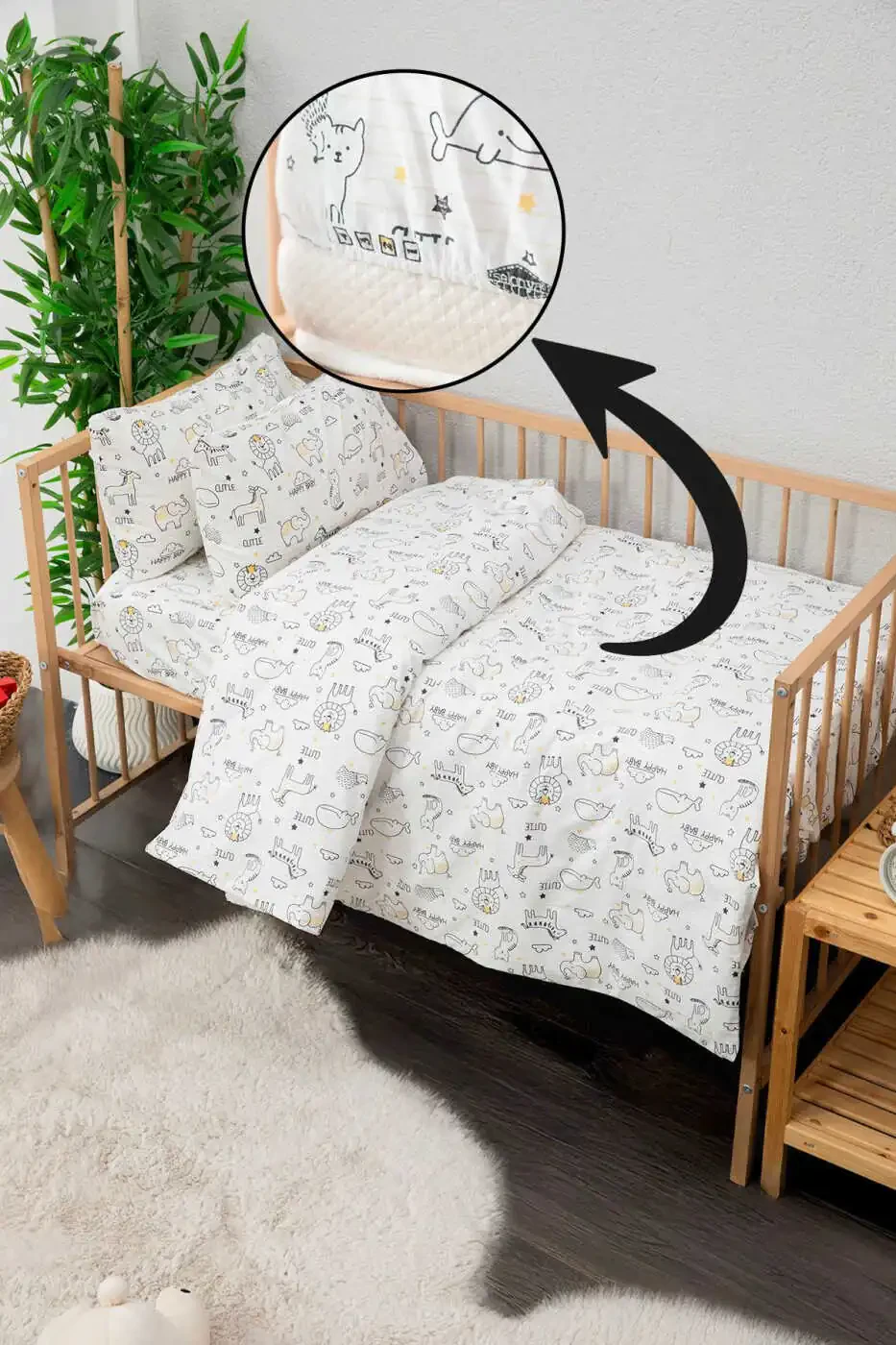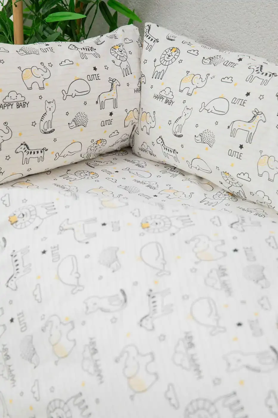 Offering the softest and healthiest sleep experience for your baby, the Baby 100% Cotton Happy Baby Bedding Set cares for your baby's sensitive skin while dazzling with its stylish design. Thanks to its 100% cotton fabric, it does not irritate your baby's skin, allows it to breathe, and prevents sweating. Its soft texture provides a comfortable and peaceful sleeping environment for your baby. This bedding set has elegant patterns and soft colors that will add elegance to your baby's room. Offered as a set, this product is designed to meet all your needs. Consisting of a duvet cover, fitted sheet, and two pillowcases, the set provides a perfect fit in your baby's crib. The fitted sheet is easily attached to the bed and prevents slipping, so your baby can sleep safely. Produced with high-quality materials and workmanship, this bedding set is durable for long-term use. It is machine washable at 40 degrees and can be dried easily. Designed with your baby's health and comfort in mind, this product is an ideal choice for parents. Offered in a transparent gelatin package, this bedding set is delivered to you hygienically and safely. Order this product now, offered with the assurance of Favora Home, and increase your baby's sleep enjoyment! Remember, you can order a maximum of 10 of this product and you have the right to return it for free within 15 days.