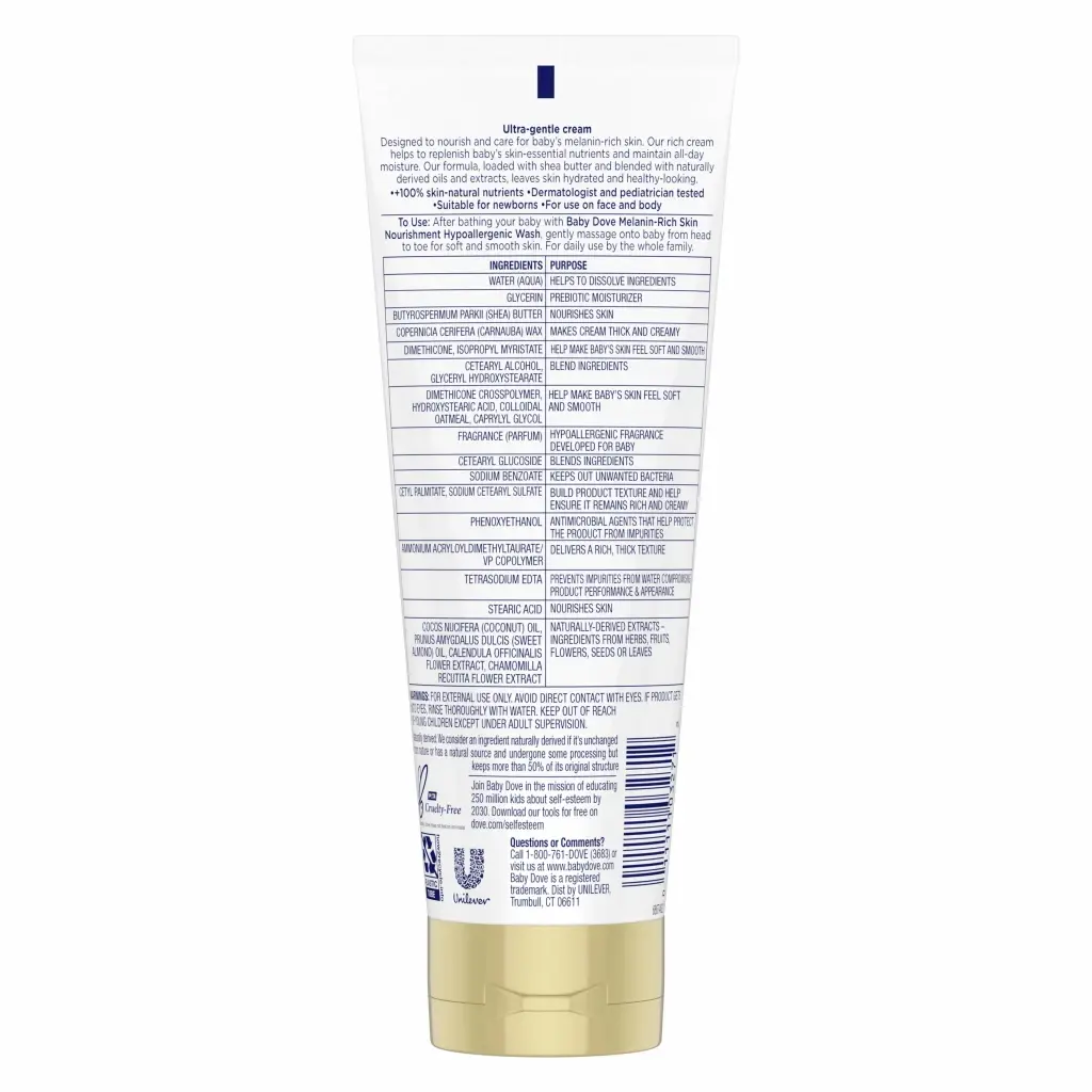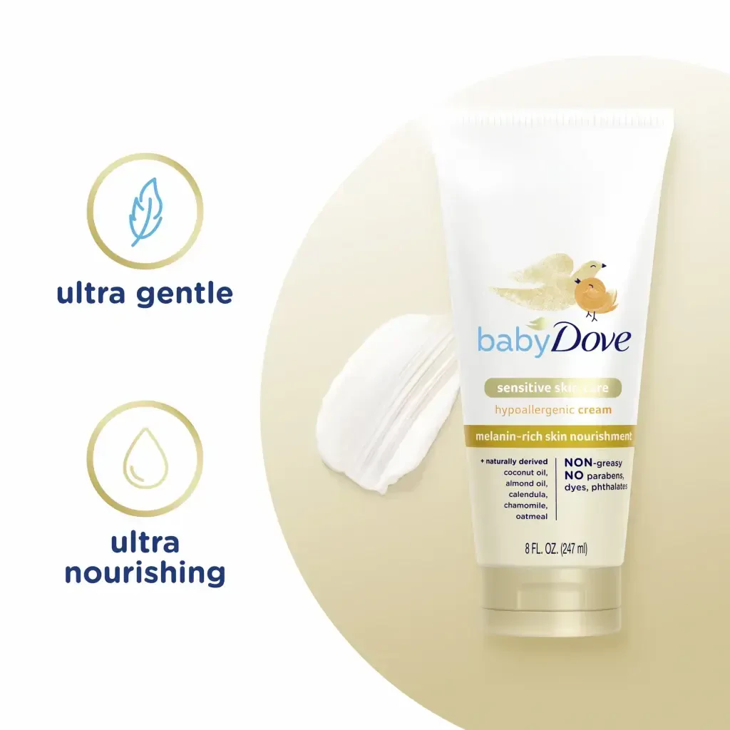 Baby Dove Sensitive Melanin-Rich Cream Newborn Hypoallergenic Nourishing Moisturizer is a specially formulated, daily moisturizer for delicate babies, developed by dermatologists to preserve your baby's delicate skin balance.