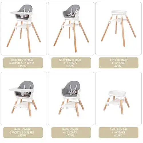 If you're looking for a versatile and practical high chair that grows with your baby, you've come to the right place! The 6 in 1 Convertible Wooden High Chair is designed to meet all your baby's needs from their first days to their toddler years.