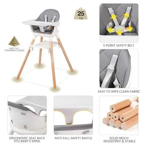 The 6 in 1 Convertible Wooden High Chair is a safe, practical, and versatile choice for your baby. Order now and make your baby's meal times more enjoyable!