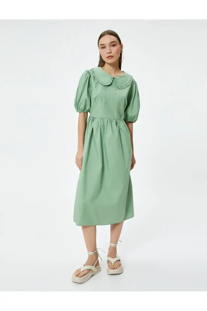 Balloon Sleeve Midi Baby Collar Cotton Dress-Green is a design that combines elegance and comfort, and is a candidate to be an indispensable part of your wardrobe. The midi-length cut offers an elegant silhouette that adapts to any environment, while the balloon sleeve detail adds a feminine touch. The baby collar gives the dress an innocent and cute look. Thanks to its 100% cotton fabric, it offers a breathable and comfortable wearing experience all day long. The green color represents naturalness and vitality, adding energy to your style.Product DescriptionBalloon Sleeve Midi Baby Collar Cotton Dress-Green is a must-have piece in every woman's wardrobe with its modern and timeless design. This dress can be easily preferred for daily use as well as for special occasions. The midi length cut offers a stylish and comfortable look, while the balloon sleeve detail adds movement and originality to the dress. The baby collar adds a sweet and elegant touch to the dress, highlighting your feminine style. Its 100% cotton fabric gently touches your skin and provides all-day comfort. Thanks to the breathability of the fabric, it minimizes the problem of sweating even in hot weather. The green color reflects the freshness and energy of nature, adding vitality to your style. The loose and comfortable cut of the dress easily adapts to all body types. Whether you make a stylish combination with high heels or create a more casual style with sandals, the Balloon Sleeve Midi Baby Collar Cotton Dress-Green will accompany you in any case. This dress, which you can adapt to different styles with accessory choices, is one of the most enjoyable ways to reflect your style. It allows you to feel stylish and comfortable at weddings, invitations, business meetings or daily outings. The balloon sleeve detail balances your body lines by making your shoulders look wider, while the baby collar softens your facial features. The midi-length skirt cut elegantly displays your legs without restricting your freedom of movement. The fabric quality of the dress offers a long-lasting use and preserves the vibrancy of its colors for a long time. Balloon Sleeve Midi Baby Collar Cotton Dress-Green is not just a dress, but also a lifestyle. You will always feel special with this dress that combines elegance, comfort and naturalness. Discover this dress, which is a candidate to be the most loved piece of your wardrobe, immediately and bring a new breath to your style.Product features* Midi length cut* Balloon sleeve detail* baby collar* 100% cotton fabric* Green color* Comfortable and loose fit* Breathable fabric* Suitable for daily and special occasions* Can be combined with different accessories* Long lasting useAdditional InformationModel's size: S. Machine washable at 30 degrees. Bleach is not recommended. Can be ironed at low temperature. Dry cleaning can be done. Please follow the washing instructions.