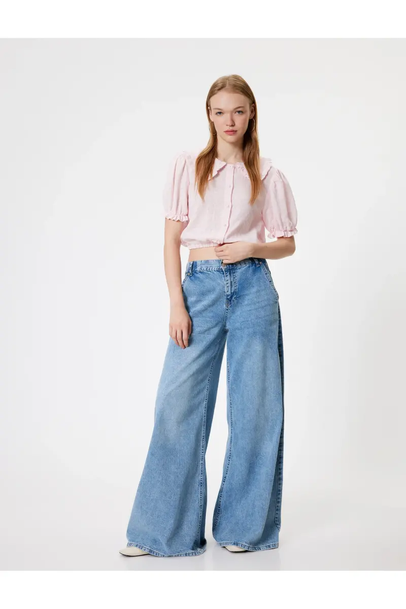 Balon Kol Crop Bluz Geniş Bebe Yaka Düğmeli Pamuklu-Gül