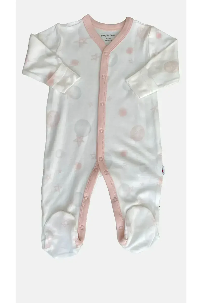 Bambu bebek tulumu, patikli tulum, beyaz uzay desenli, bebek giyim, yenidoğan tulum, organik tulum, hipoalerjenik, antibakteriyel, çıtçıtlı tulum, uzun kollu tulum