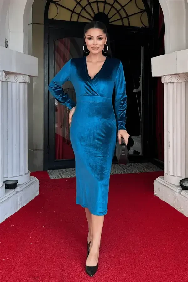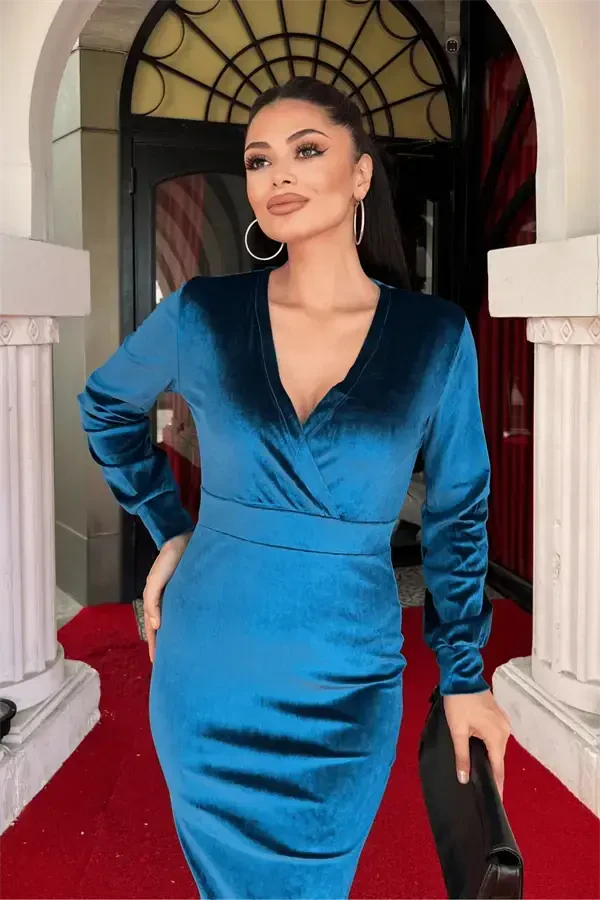 Почувствуйте элегантность и изящество с бархатным платьем-карандаш с запахом. Очаровательный оттенок бирюзового цвета придает этому эксклюзивному платью особую атмосферу. Вы будете ослеплять в любой обстановке, от особых мероприятий до деловых встреч, от повседневной элегантности до особых моментов. Мягкая текстура бархатной ткани ласкает вашу кожу, а запах подчеркивает вашу женственность. Юбка-карандаш идеально облегает ваши формы, создавая элегантный силуэт. Это платье станет незаменимой вещью в вашем гардеробе!Длина платья от плеча до низа составляет 105 см (может варьироваться в пределах 1-3 см), что делает его элегантным и удобным вариантом. Небольшая эластичность бархатной ткани не ограничивает вашу свободу движений, а полноценный крой идеально облегает ваше тело. Бесподкладочная конструкция сохраняет легкость платья и обеспечивает комфорт даже при непосредственном контакте с кожей. Это платье без застежки-молнии легко надевать и снимать, что делает его практичным в использовании.На модели изделие размера S/36. Параметры модели: Рост: 1,68 см, Вес: 52 кг, Обхват груди: 85 см, Обхват бедер: 90 см. Эта информация поможет вам при выборе размера. Бархатное платье-карандаш с запахом – это дизайн, который не только позволит вам выглядеть стильно, но и почувствовать себя особенной. Осветите свой день энергией бирюзового цвета и привлекайте внимание в любой обстановке. Закажите это уникальное платье прямо сейчас и поднимите свой стиль на новый уровень! Сочетайте его с туфлями на каблуках или дополните элегантным клатчем – бархатное платье-карандаш с запахом всегда будет отличным выбором.