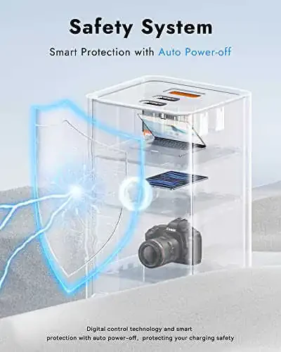 Cihaz, 3 adet AC priz ve 3 adet USB portu sunarak birden fazla cihazı aynı anda bağlamanıza olanak tanır. USB portları, hızlı şarj özelliği ile donatılmıştır ve PD40W USB C portu, uyumlu cihazlarınızı hızlı bir şekilde şarj edebilir.