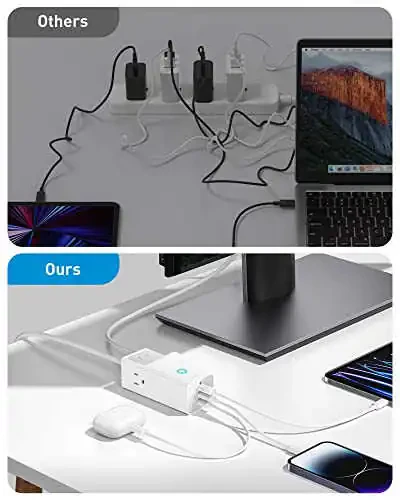 Qurilma 3 ta AC priz va 3 ta USB port bilan jihozlangan bo'lib, bir nechta qurilmani bir vaqtning o'zida ulashingiz mumkin. USB portlar tezkor zaryadlash qobiliyatiga ega va PD40W USB C port mos keladigan qurilmalaringizni tezkor zaryad qilishi mumkin.