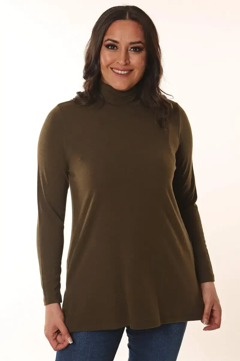 If you are looking for a piece that offers both comfort and elegance in your wardrobe these days when you start to feel the slight breeze of autumn, the Basic Half Turtleneck Khaki Blouse is for you! Allowing you to create a modern and free style both at home and in the office, this blouse draws attention with its soft texture and stylish design. This piece, which allows you to look stylish without sacrificing your comfort in your living spaces, also offers functionality with its half turtleneck that will keep you warm in cold weather. Thanks to its loose fit, the Basic Half Turtleneck Khaki Blouse allows you to move freely throughout the day, exhibiting an elegant stance without hugging your body. With its hip-length and long sleeves, this blouse, which captures both a modern and classic look, can be easily combined with different bottom clothing pieces. Whether you combine it with jeans, skirts or trousers, always achieve a stylish and meticulous look. The fabric, which is produced from a mixture of 67% Polyester, 29% Viscose and 4% Elastane, gently touches your skin with its soft texture and at the same time offers long-term use with its durable structure. The khaki color perfectly matches the earthy tones of autumn, and also suits all skin tones. You can easily prefer this blouse in daily life, at work, at friends' meetings or at special invitations. The Basic Half Turtleneck Khaki Blouse is a candidate to be one of the indispensable pieces of your wardrobe with its design that combines elegance and comfort, its quality fabric and its useful structure. Designed for modern and free-spirited women, this blouse will make you stand out in every environment.
