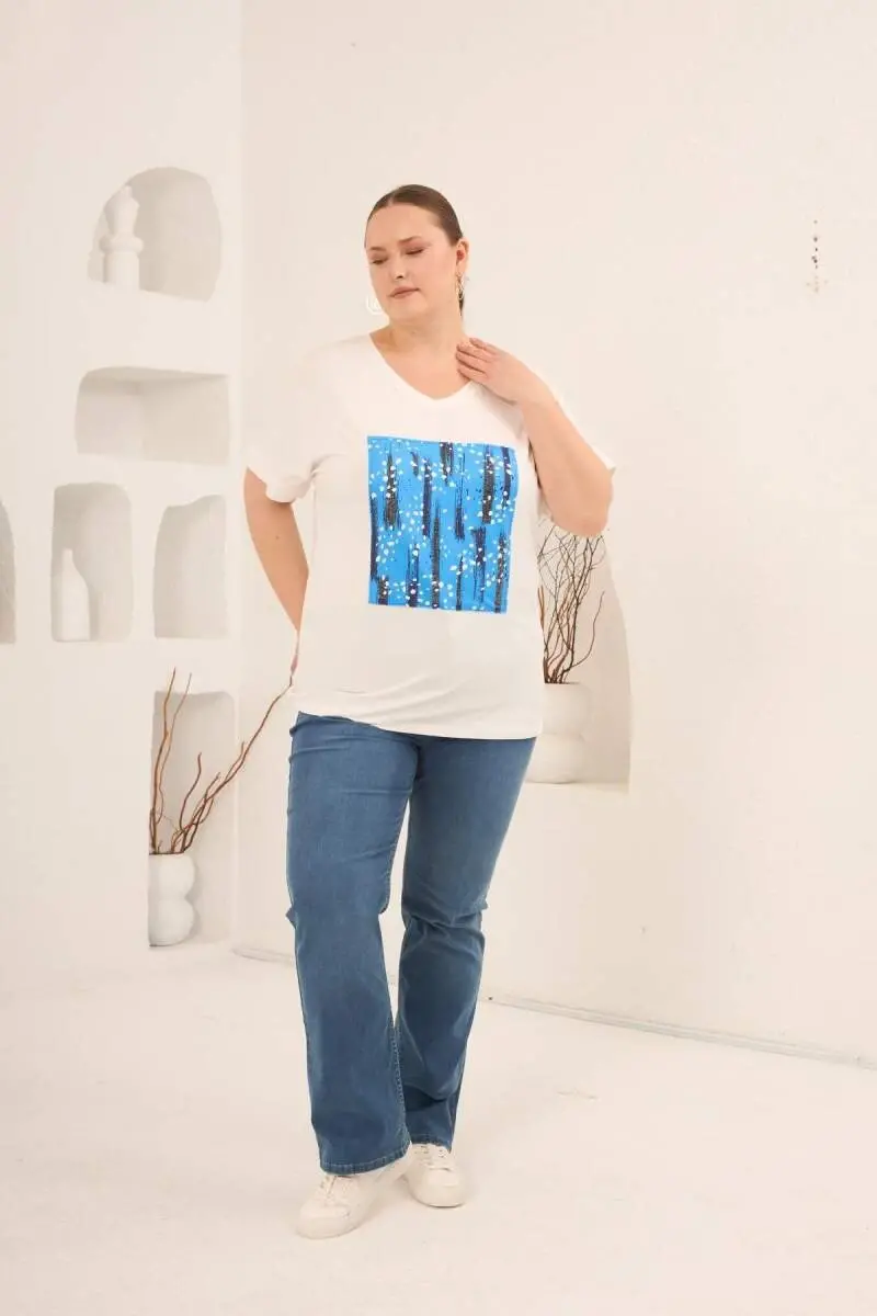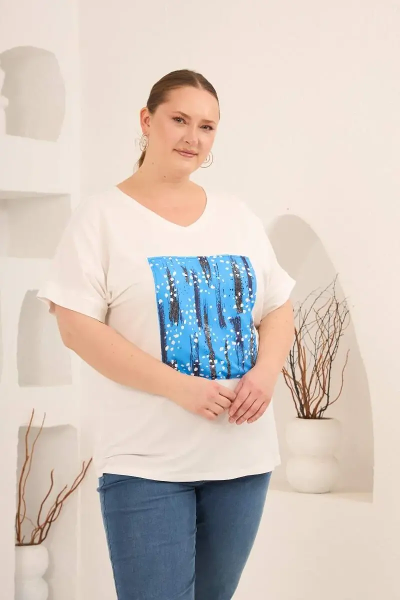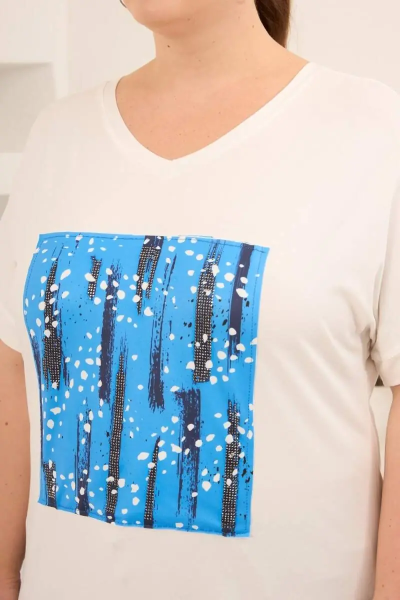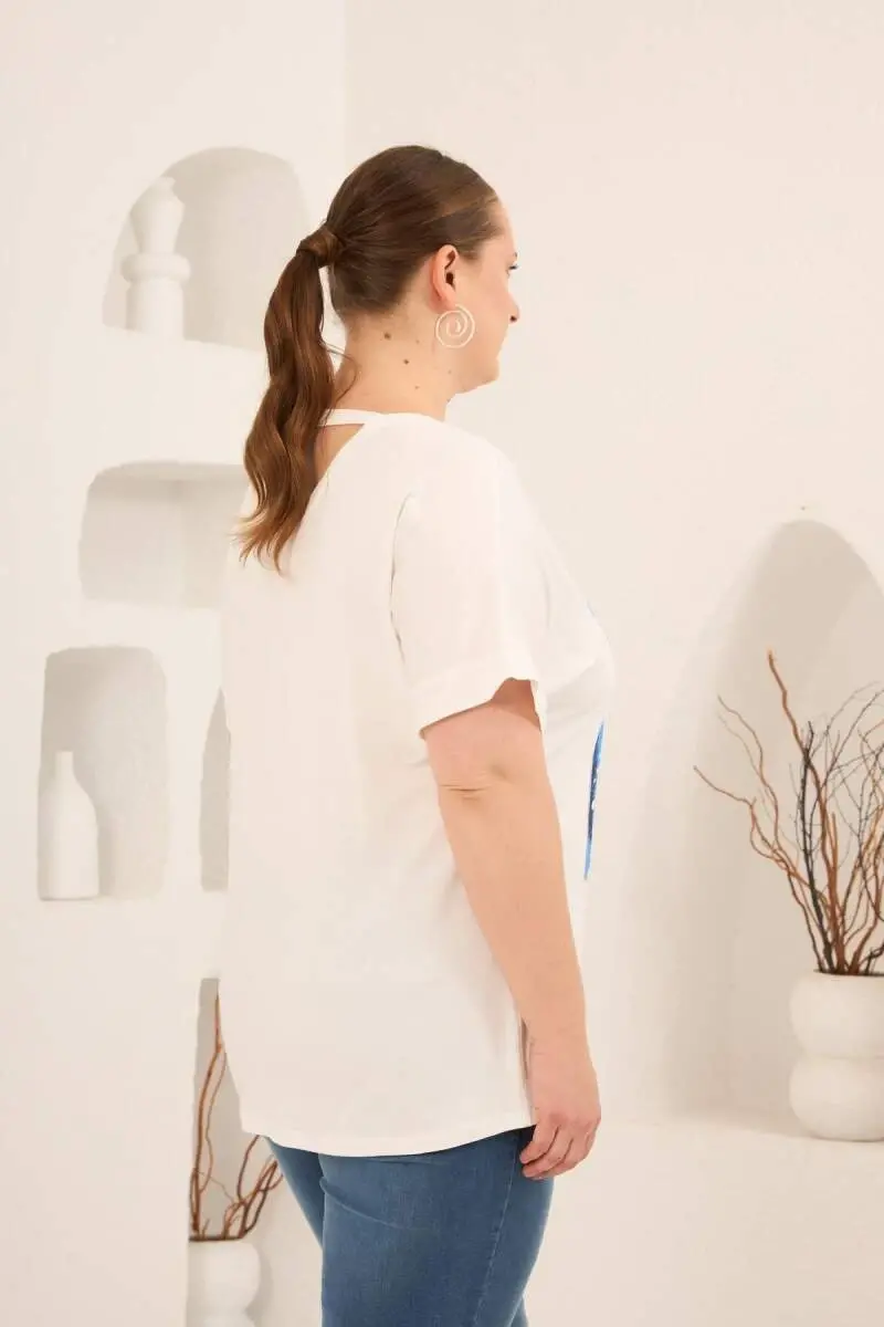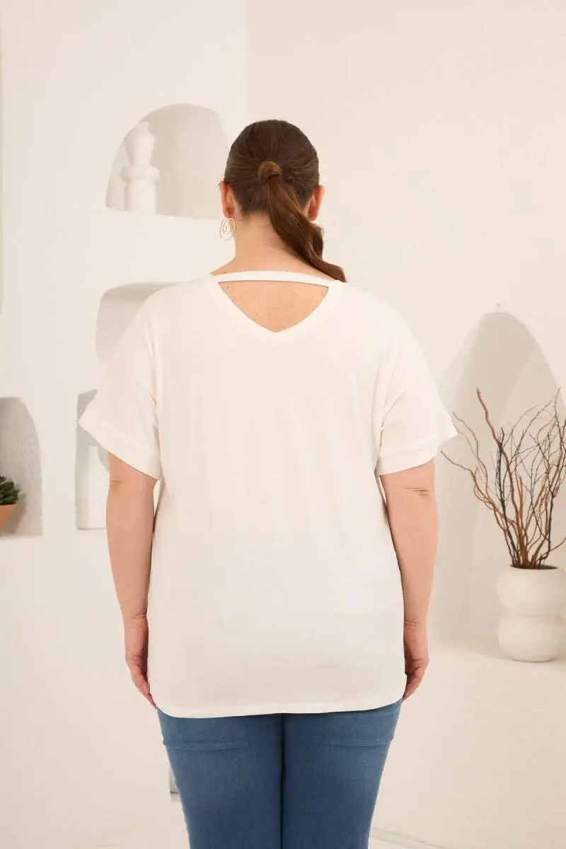 Baskılı Taş Detaylı Büyük Beden Tişört Ekru