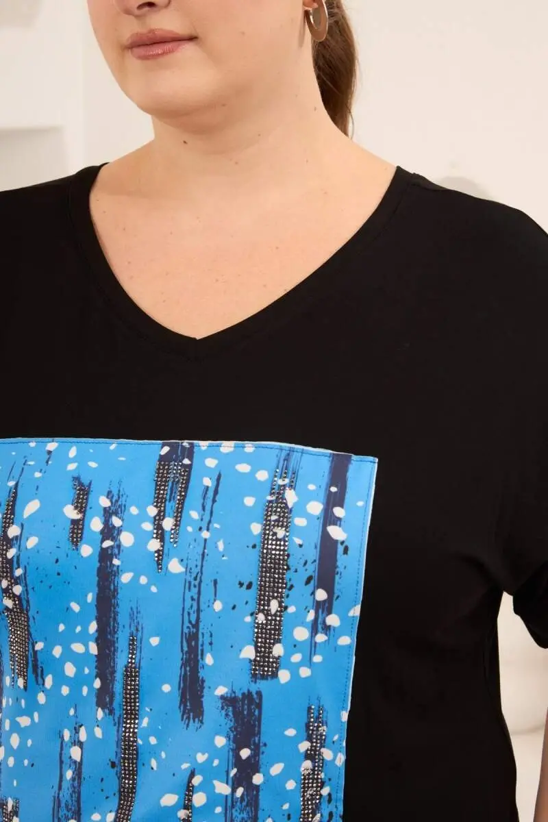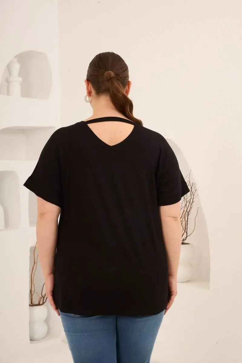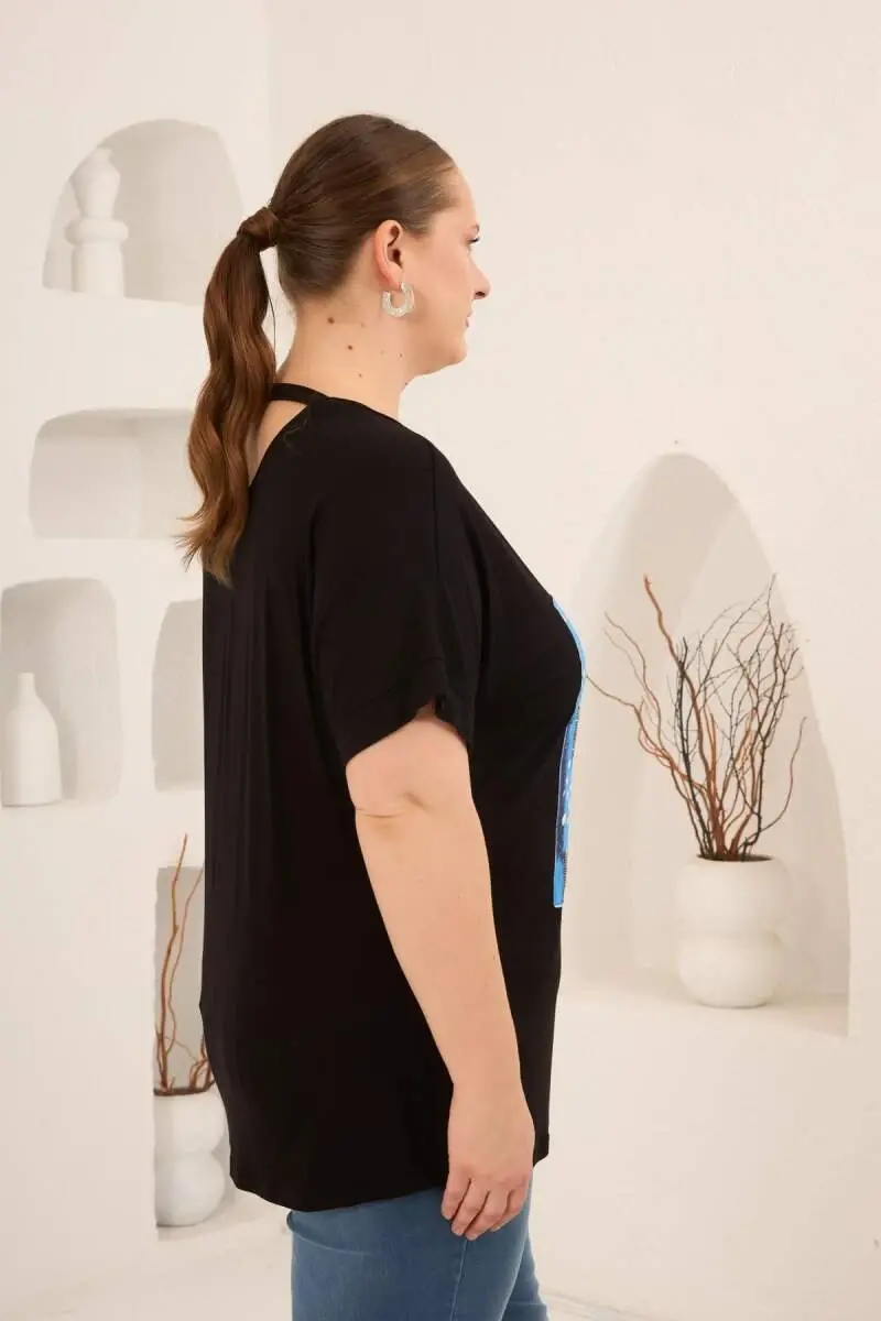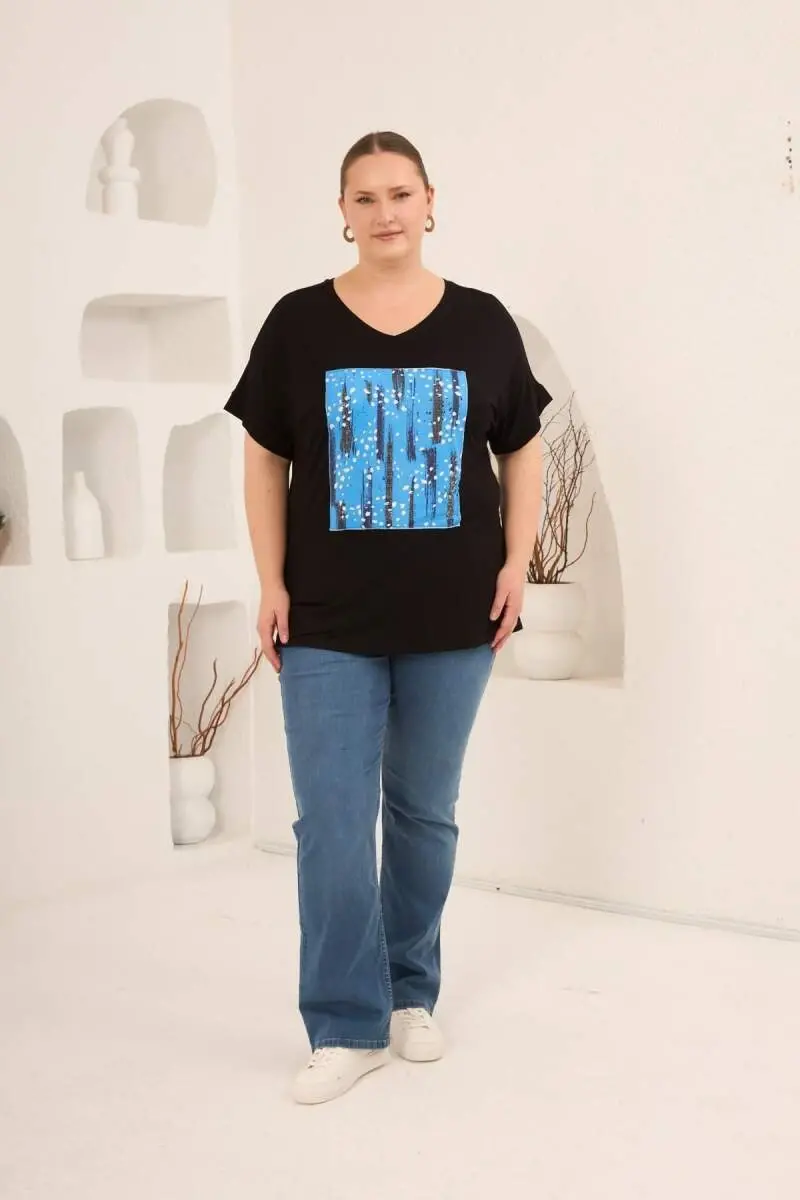 Baskılı Taş Detaylı Büyük Beden Tişört Siyah