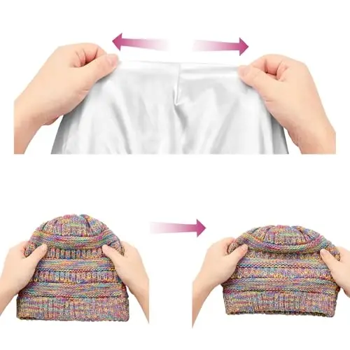 Brave the winter cold with the Beanies Women Satin Lined Beanie! This special design beanie will both complement your style and protect your hair. Made from a high-quality acrylic and polyester blend, this beanie caresses your skin with its soft texture and gives you a feeling of warmth that lasts all day. You can pull the cuff down to protect your ears in cold weather, providing extra warmth. This is not just a beanie, but also a protective shield for your hair! The satin lining on the inside protects your hair's moisture and reduces friction, preventing wear and tear. Unlike other materials such as wool and cotton, satin preserves the natural structure of your hair and helps it stay healthier. It protects your hair against the negative effects of wind, sun and cold weather. Thanks to its specially designed satin lining, you can easily put on and take off this silk-lined beanie without messing up your hairstyle. With its flexible structure that adapts to every head size, this slouchy beanie fits snugly on your head and gives you a warm hug. Whether you dress in a sporty or classic style, this beanie adapts perfectly to any combination. With multiple color options, you can add a different touch to your winter outfits. You can use this beanie while skiing, snowboarding, sledding, ice skating or other outdoor sports. Beanies Women Satin Lined Beanie is a perfect gift for birthdays, Halloween, Valentine's Day, Thanksgiving, Christmas and other special occasions. It can be a wonderful surprise for yourself, your friends, your family or your loved ones. Enjoy the winter with this stylish and useful beanie!