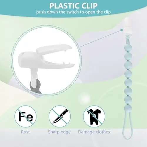 Emzik klipsleri düzenli olarak temizlenmeli ve hasar belirtileri gösterdiğinde değiştirilmelidir. Klipsi bebeğin yatağına veya beşiğine takmaktan kaçının. Bebeğin gözetimi altında kullanılması tavsiye edilir. Ürün, güvenlik standartlarına uygun olarak üretilmiştir.