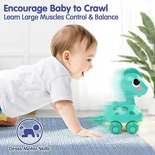 BPA-free and non-toxic eco-friendly premium safe materials 【Attract Baby to Crawl & Build Large Muscles】When touching the sensor on the back of the baby toys, the baby crawling toys will move, nodding head, and also play happy baby tunes music with LED lights. The baby toys are very attractive which will encourage your baby to chase & crawl. Your little one can develop gross motor skills and learn how to control large muscles, which enable crawling, walking, running, jumping & body balance during playtime. Perfect choice as baby toys 6 to 12 months 【Touch & Go Modern Technology, Improve Hand-Eye Coordination】The infant toys come with modern TOUCH technology. You and your baby just touch the sensor and it will play, which is much easier than pressing a button, especially for your baby’s little hands. Your little one will improve hand-eye coordination and learn cause & effect when playing. Good choices as infant toys 6 to 12 months, 6 month old baby toys 9 month old baby toys 12-18 months, baby boy toys for 1 year old boy gifts 【Premier Materials & Polished Smooth Edges Safe to Baby】 The baby toys are made of BPA-free and non-toxic premium materials, comply with strict international safety standards, and are 100% safe for your baby. It does not contain small parts to avoid choking hazards. The burr-free polished smooth edges will not hurt your baby’s soft skin. It is perfectly sized for the baby’s little hands to train grasp ability. The soft light design helps visual development and does not harm the baby’s eyes 【Bump & Go Design Guide Safe Direction, Comes Two Play Modes】 The baby toys are equipped with universal wheels. Its bump & go function can self-avoid obstacles, which can guide the baby in a safe direction and helps develop spatial awareness. The toys come with 2 modes. In “Go mode”, your baby can chase & crawl after it. In “Stop mode”, your baby can sit & play with music & fun sounds. It comes with auto shut-off to save battery for longer usage. You can re-start it to play after auto shut-off 【Durable Shatterproof Materials & Worry-free After-Sale Service】 The baby musical toys are made of shatterproof materials, so they are sturdy and durable enough to hold up for long-lasting performance, even if your little one toss or throw them away. Requires 3 x AAA batteries (Not Included). Hope our toddler toys age 1-2 bring your family more happiness. If there is any issue after use, just let us know and we will make a satisfying solution special for you