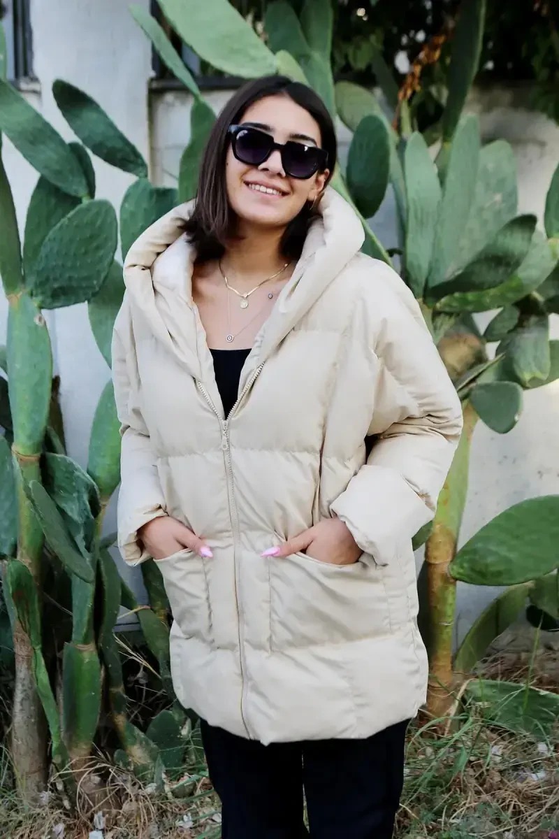 Beige Hooded Front Pocket Oversize Women's Puffer Jacket is the perfect option to keep you warm and stylish in cold weather. This jacket, carefully designed by İpli, adapts to every style with its modern and comfortable cut. The oversize model does not restrict your freedom of movement, while the hood allows you to be prepared for sudden weather changes. The front pocket design offers a useful and stylish detail; you can safely carry your phone, keys or other small items. The beige color will easily match any combination and will be an indispensable part of your wardrobe. This puffer jacket, which you can easily prefer in daily use or special activities, is a perfect combination of comfort and style. It is made of high quality materials and offers long-lasting use. It is an ideal choice for women who do not want to compromise on their elegance while protecting themselves from the cold in winter. Whether you combine it with jeans, tights or skirts, you will always look stylish. This jacket will be indispensable for cold weather and will keep you warm while keeping you trendy. The hooded design protects your head in windy and rainy weather, while the oversize cut allows you to dress in layers. Front pocket details offer practical use, while the beige color makes it easy to combine with any outfit. Stay warm and stylish in winter with this puffer jacket. This special design, offered for sale on Trendyol, is available in limited stock, so hurry up and add this unique piece to your wardrobe! Remember, this jacket is not just a piece of clothing, it is also a style statement.