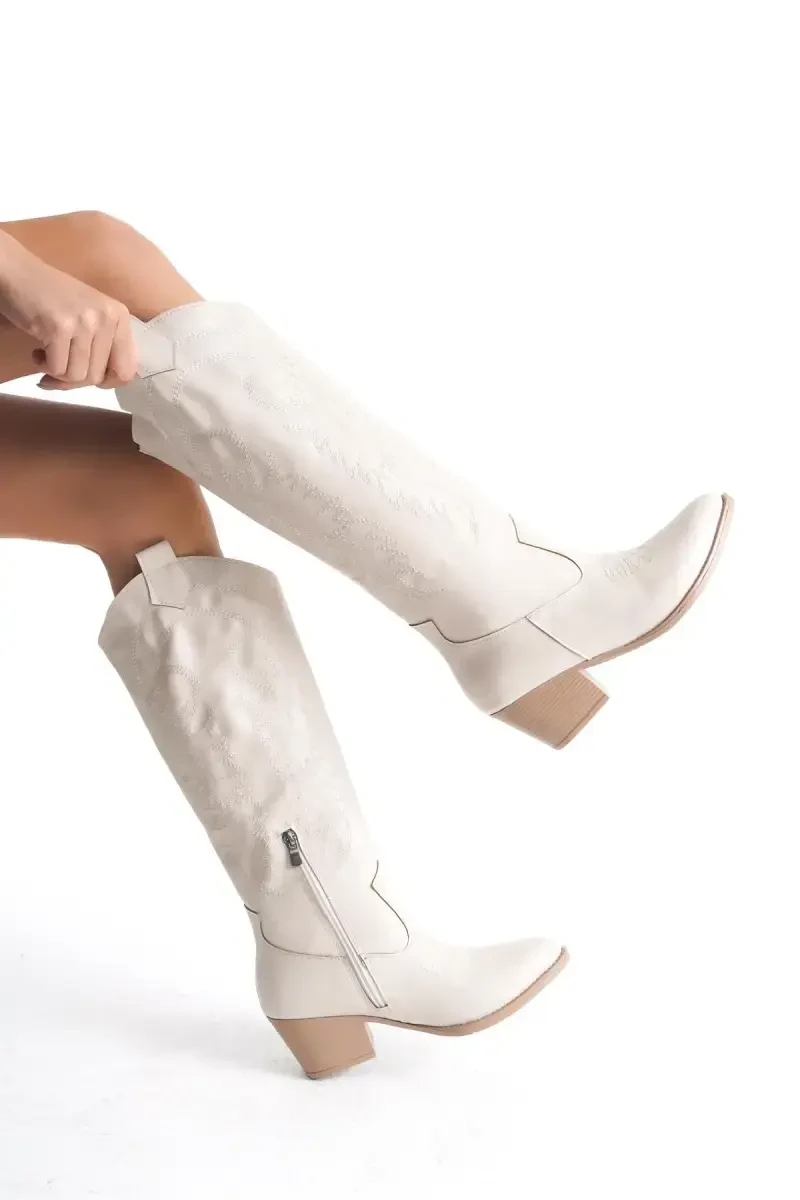 Beige Leather Embroidered Zippered Western Cowboy Women's Long Below-the-Knee Boots are a must-have piece in the wardrobe of stylish women. This unique boot combines western inspirations with modern design, adding a unique touch to any outfit. The warmth and naturalness of the beige color easily match any outfit, while the delicate embroidery details turn the boot into a work of art. Whether in daily wear or at a special event, you will always be stylish and eye-catching with these boots. Offering practical use thanks to its zippered design, this boot allows you to express your style without sacrificing your comfort throughout the day. The long below-the-knee length keeps your legs warm and elegantly emphasizes your silhouette. Produced using high-quality leather material, this boot will maintain its elegance for many years and will accompany you. A perfect option for those who love the western style, this boot is also an ideal starting point for those who want to try different styles. Make a difference at every step with this special boot that will complement your outfits, reflect your style and give you confidence. Beige Leather Embroidered Zippered Western Cowboy Women's Long Below-the-Knee Boots are not just a shoe, but also a form of expression. Freely reflect your style with these boots and attract attention in any environment. This boot, which will be an indispensable part of your wardrobe, will provide you with a unique experience by offering both elegance and comfort together.