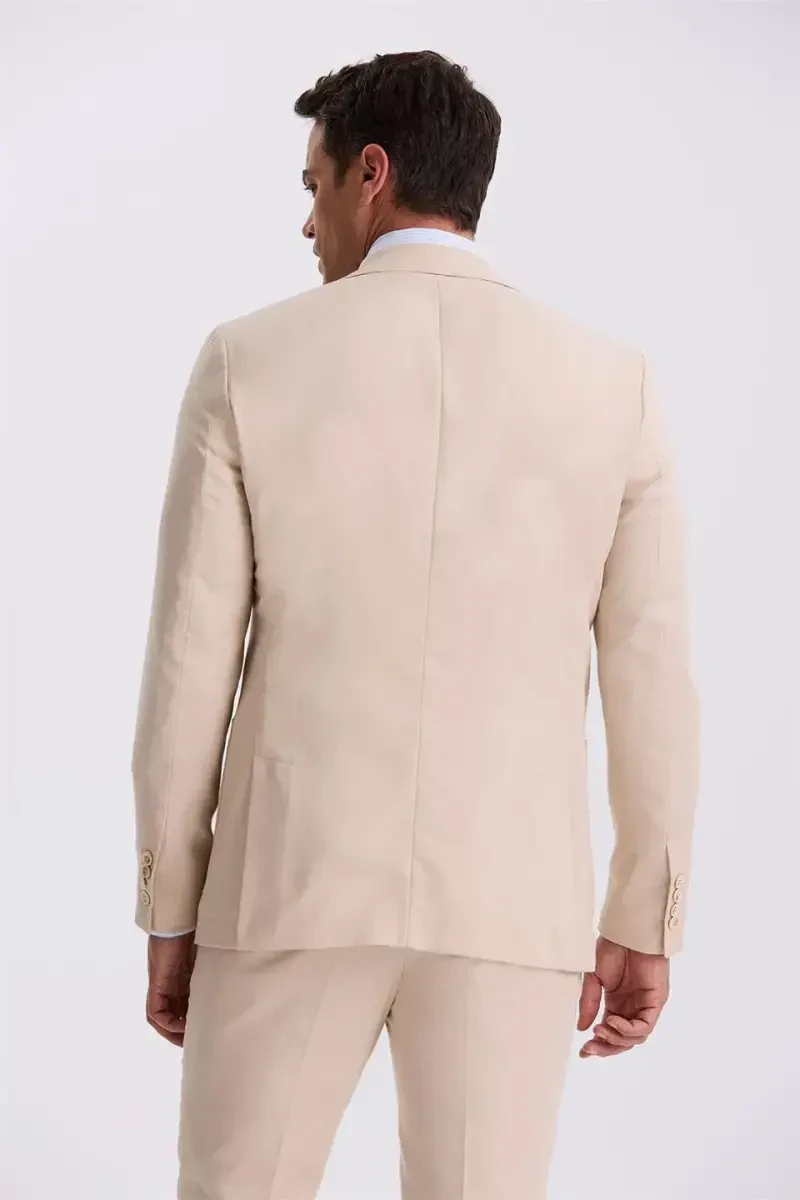 **Beige Slim Fit Mono Collar Tencel Fabric Double Vent Patch Pocket Suit**