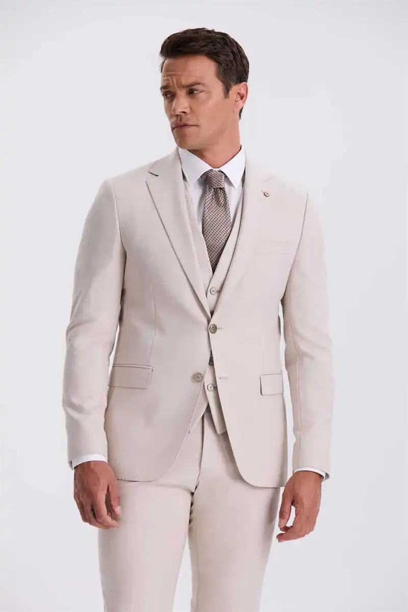 Beige Slim Fit Suit with Vest | Men's Clothing, Mono Collar, Double Slit