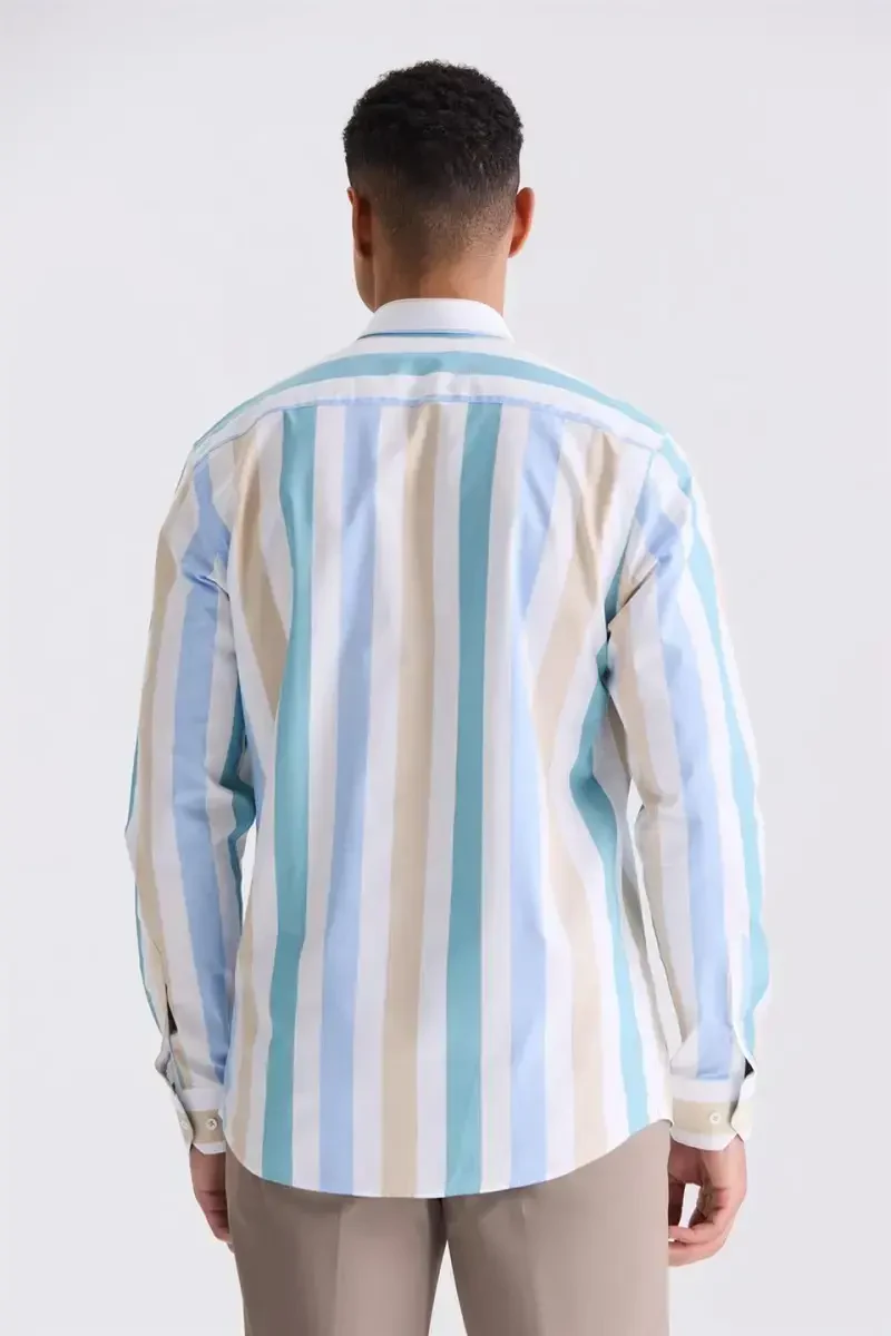 **Beige Slim Fit Striped 100% Cotton Shirt** Combining comfort and style with its 100% cotton texture, this striped shirt will be a staple in your wardrobe. **Product Features:** * Made from 100% natural cotton. * Slim fit pattern perfectly fits your body and gives you a stylish look. * Offers a classic style with its striped pattern combining white and beige tones. * Provides functionality with its four-buttoned front placket and two chest pockets. * M size is used on a mannequin with a height of 187 cm and a weight of 78 kg. * The mannequin has a shoulder width of 120 cm and a chest circumference of 100 cm. Thanks to its 100% cotton fabric, it is breathable and leaves a soft feeling on your skin. With its slim fit pattern, it emphasizes your body lines and creates a stylish and modern look. The striped pattern in white and beige tones adapts to both classic and contemporary environments. You can easily use this beige slim fit striped 100% cotton shirt in all kinds of environments, from daily life to special invitations, and feel comfortable without compromising your elegance.