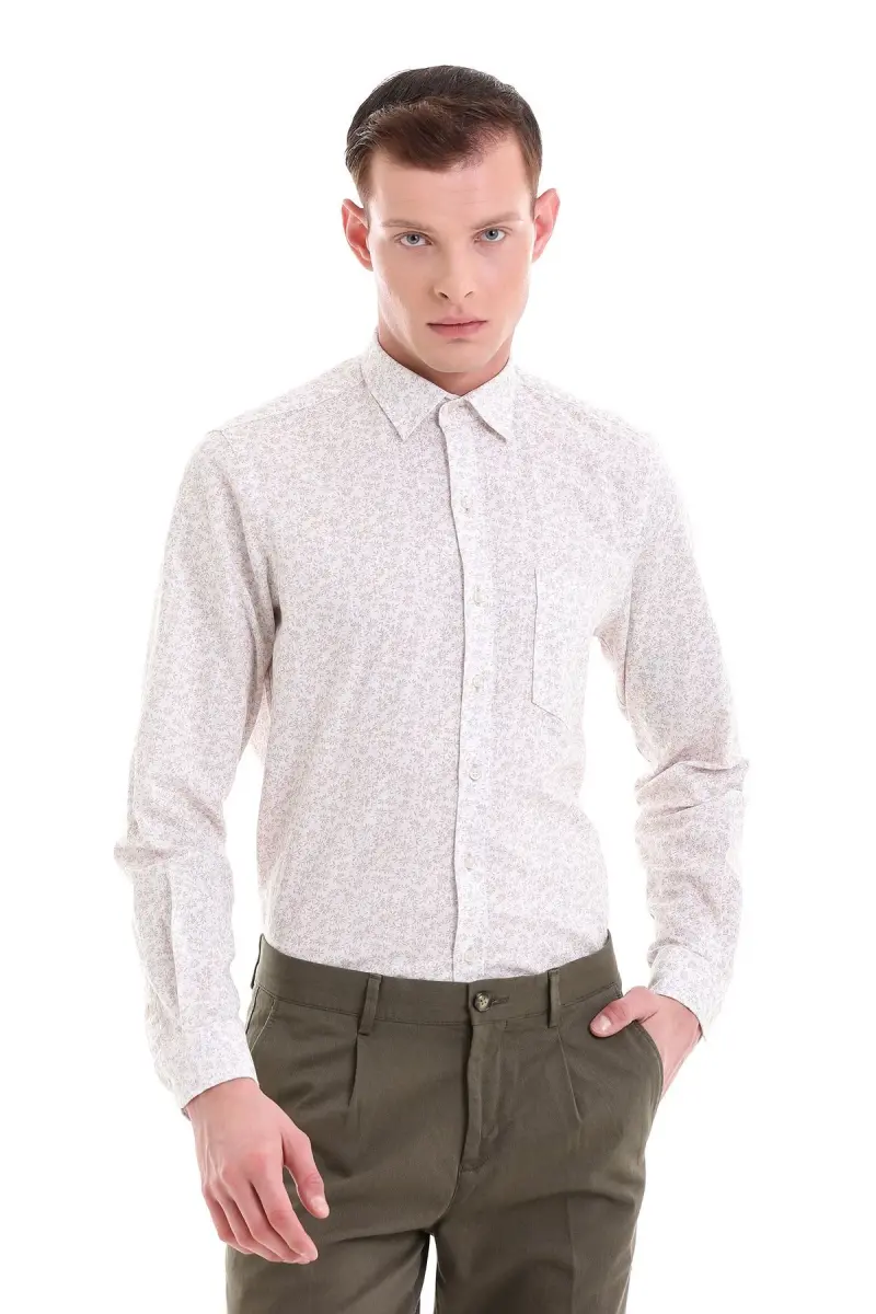 Bej Comfort Fit Baskılı 100% Pamuklu Slim Yaka Uzun Kollu Klasik Gömlek-Bej