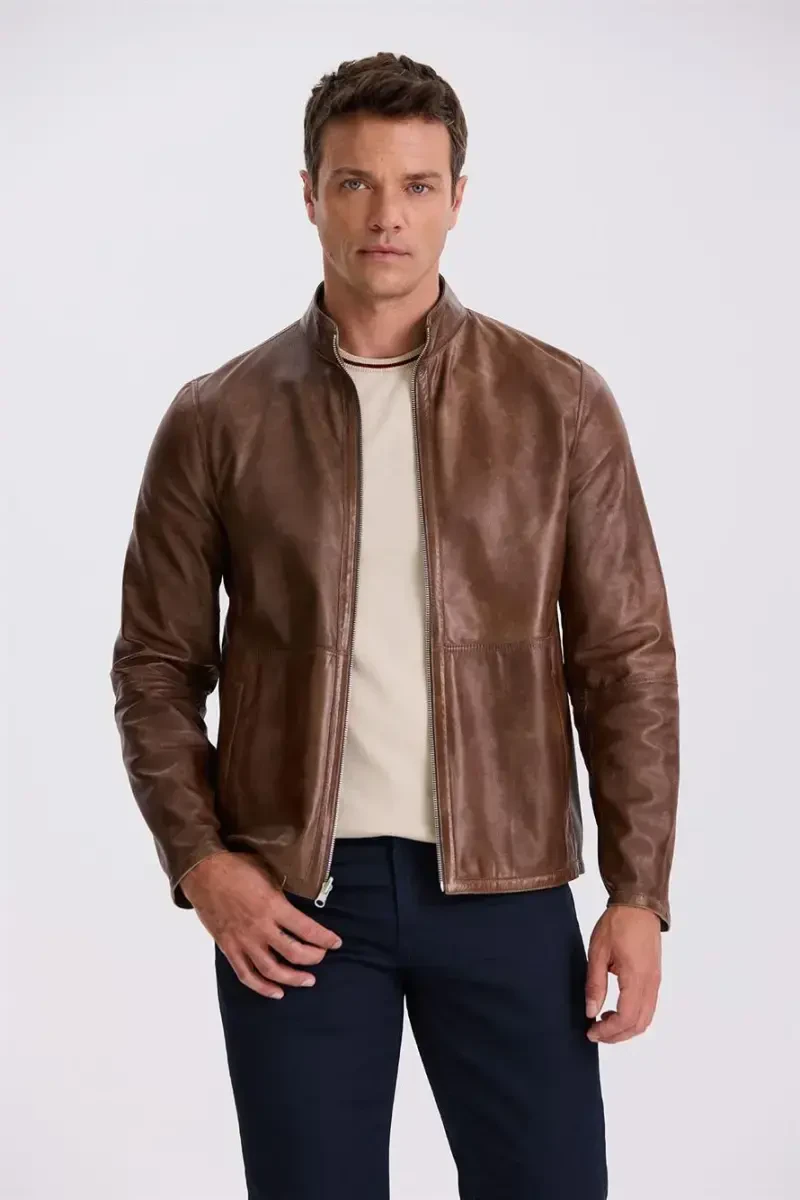 Бежевое кожаное пальто со стойкой воротником Comfort Fit 100% кожа | Роскошь в двух вариантах