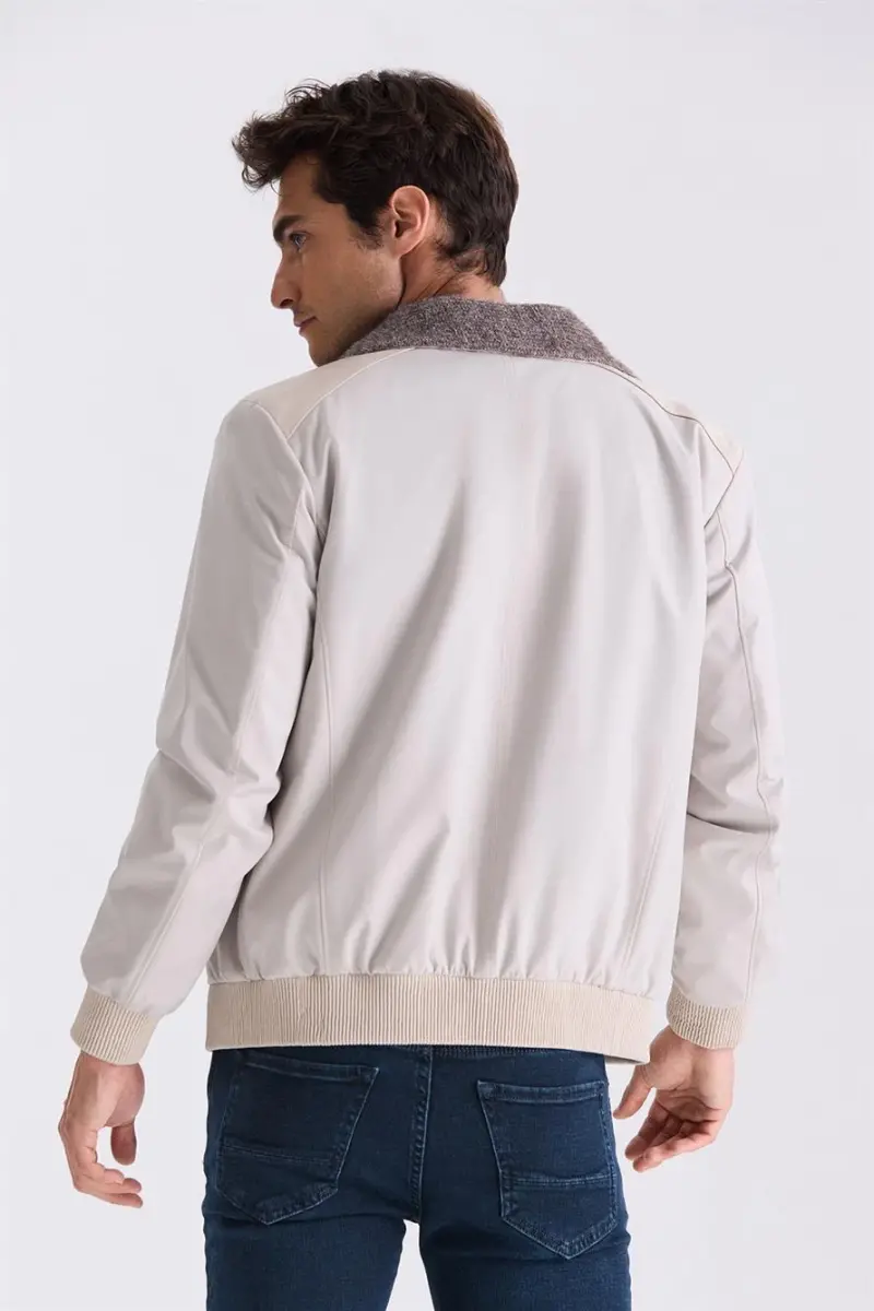 Beige Comfort Fit Fur Collar Front Zippered Jacket