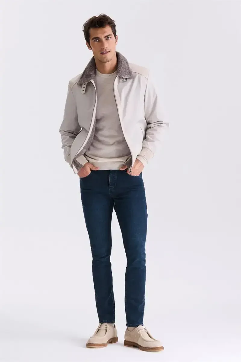 bej palto, mo'ynali yoqa, old tomoni fermuarli, charm detalli, comfort fit