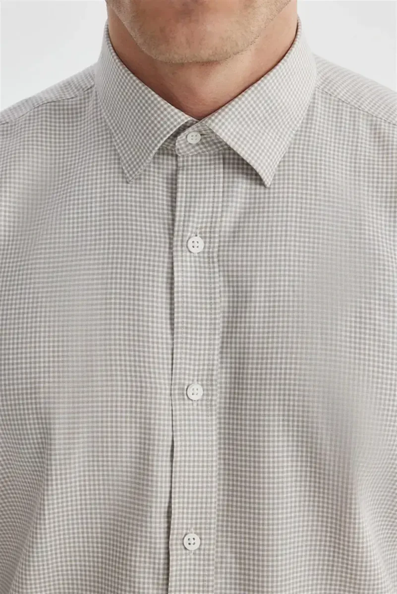 **Бежевая рубашка в клетку в стиле Comfort Fit из 100% хлопка****Характеристики продукта:*** **Материал:** 100% хлопок* **Фасон:** Comfort Fit* **Узор:** клетка* **Воротник:** классический* **Рукава:** короткие**Параметры модели:*** **Рост:** 185 см* **Грудь:** 97 см* **Талия:** 81 см**Размер модели:** M**Преимущества продукта:*** Мягкая и дышащая хлопковая ткань обеспечивает комфорт в течение всего дня.* Свободный крой позволяет легко двигаться.* Классический узор в клетку придает стильный и неподвластный времени вид.* Короткий рукав делает ее идеальным выбором для весны и лета.**Инструкции по уходу:*** Машинная стирка при 30 градусах.* Не сушить в стиральной машине.* Можно гладить.