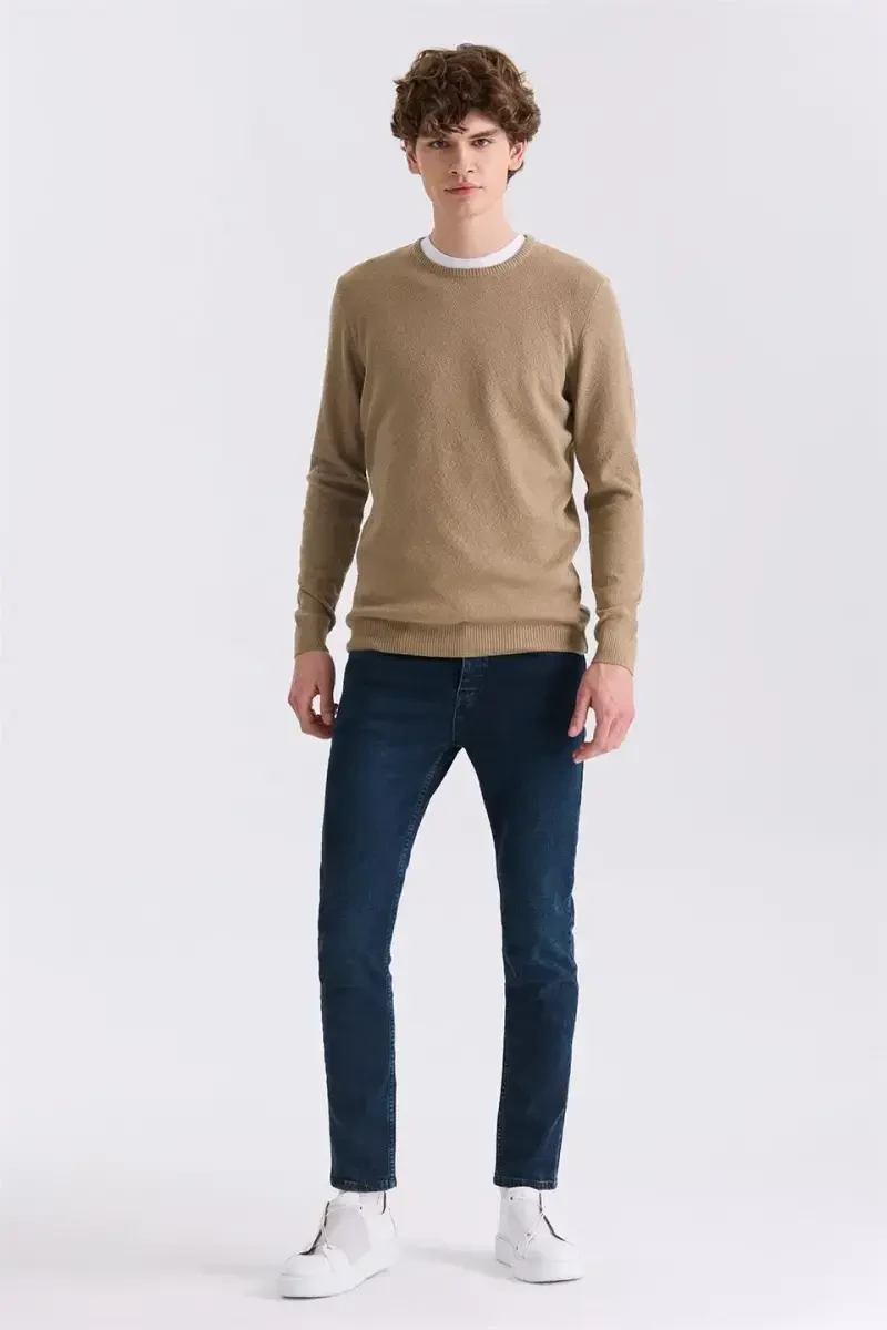 Bej Slim Fit Velosiped Yoqali Naqshli Triko Kozok | Qulaylik va Zarafet