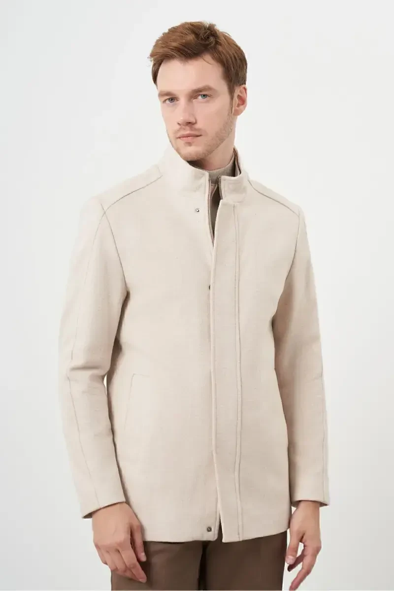 Erkaklar uchun bej rangli tugmali mandarin yoqali kaşmir paltoning xususiyatlari: