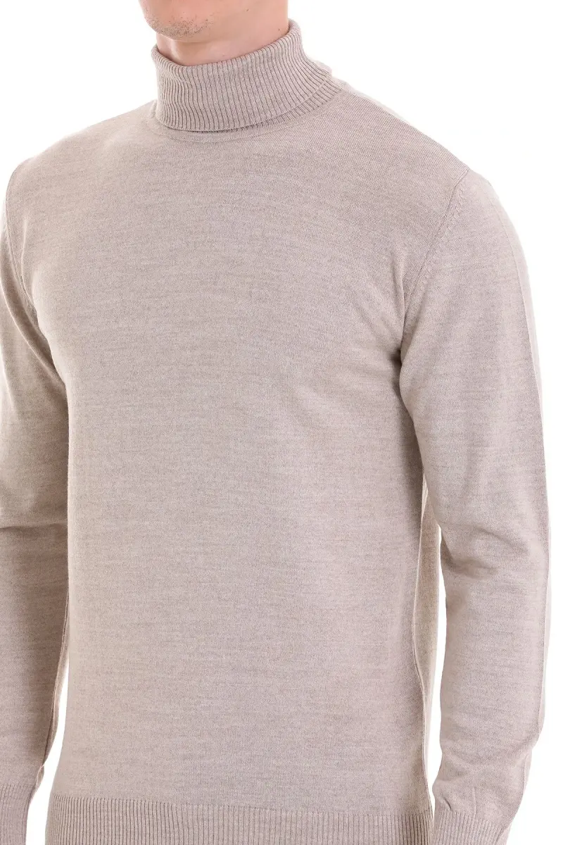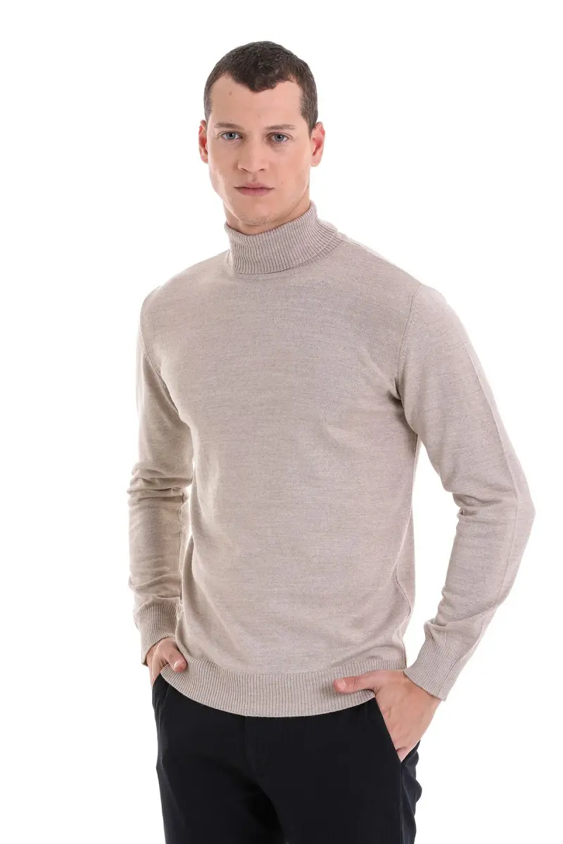 Bej Regular Fit Düz Balıkçı Yaka Yünlü Triko Kazak-Bej