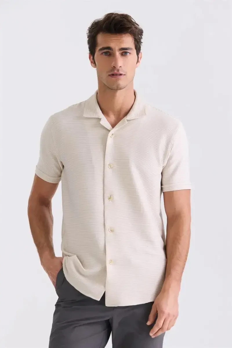 Bej Slim Fit Gömlek Yaka Düğme Detaylı T-Shirt | Şık ve Rahat
