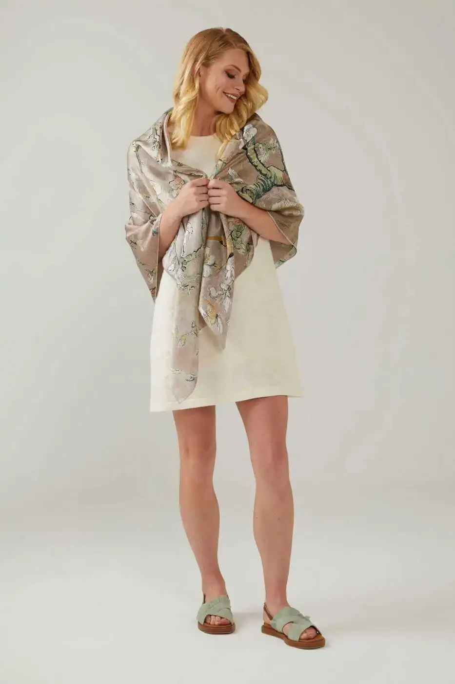 Yangi Bahor-Yoz kolleksiyamizning hayratlanarli qismi, 140x140 sm o'lchamdagi, kvadrat shaklidagi, 100% atlas ipakdan tayyorlangan Bej Van Gogh Bodom Guli Shali. Ustidagi nafis Van Gogh asari bilan stylingizga san'at teginishini qo'shadigan bu sharf, kundalik shikkingizga nafislik qo'shish uchun ideal. 100% tabiiy ipakdan tayyorlangan shalimizi teringizga va sochingizga zarar bermasdan ishlatishingiz mumkin.