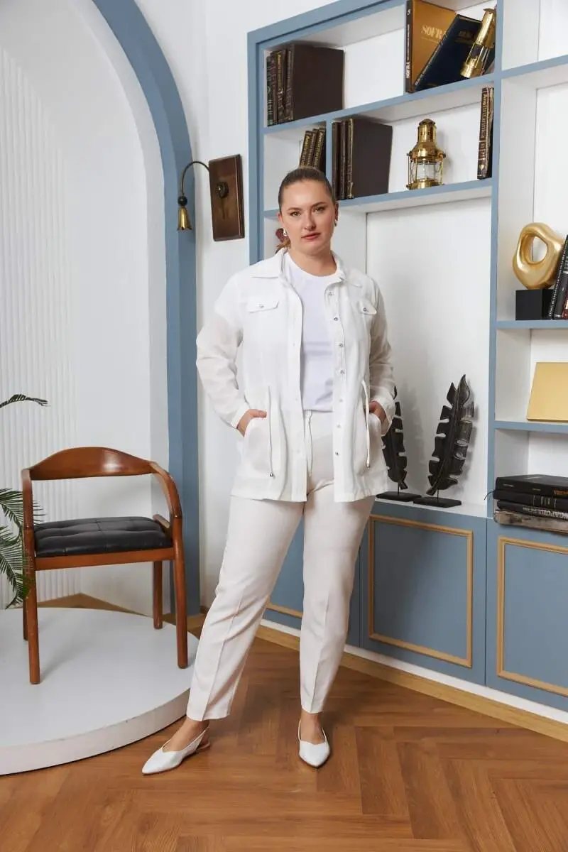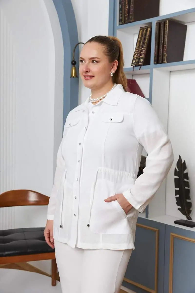 Bel Bağcık Detaylı Büyük Beden Beyaz Keten Ceket