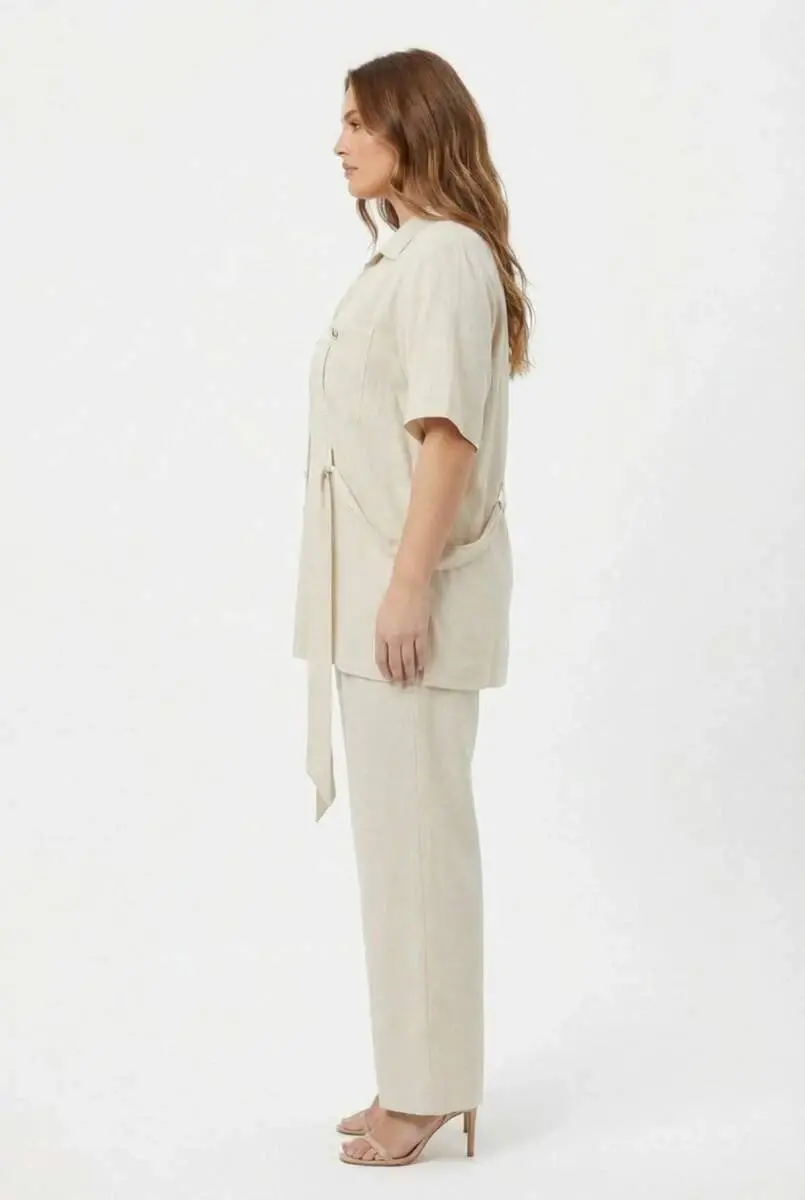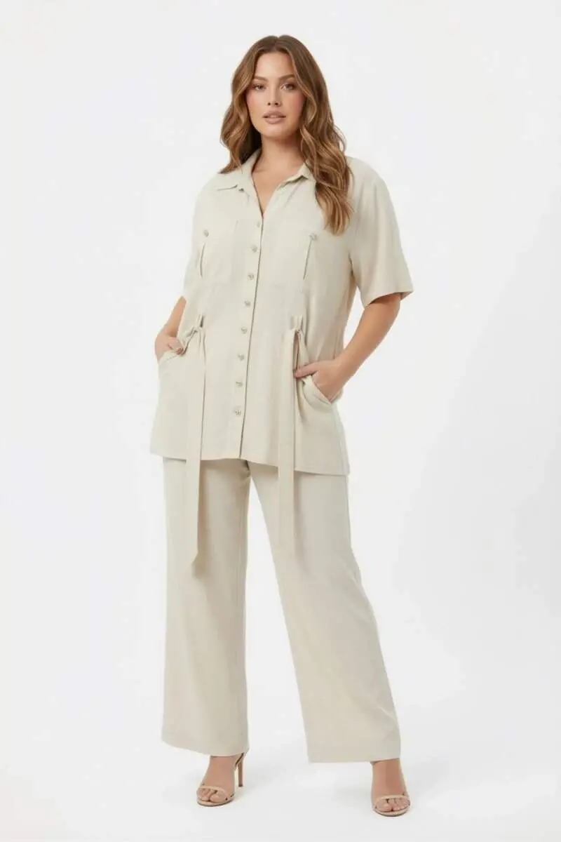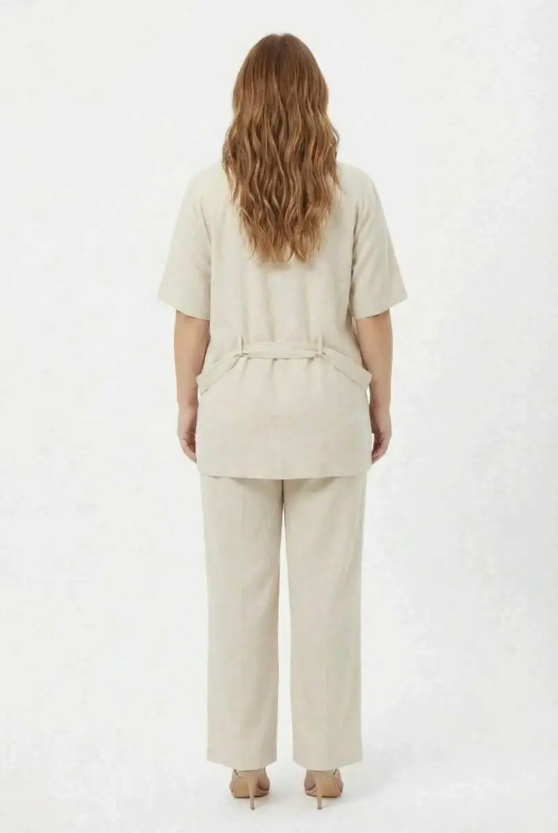 Bel Bağcık Detaylı Kadın Büyük Beden Ceket Pantolon İkili Takım Bej