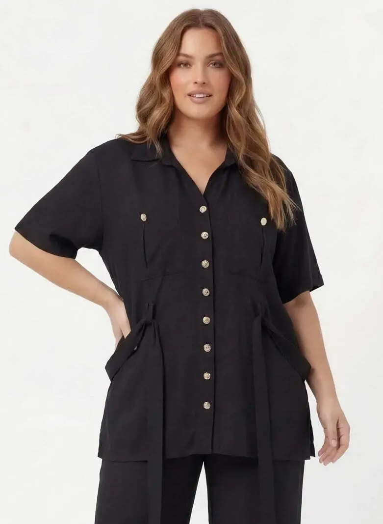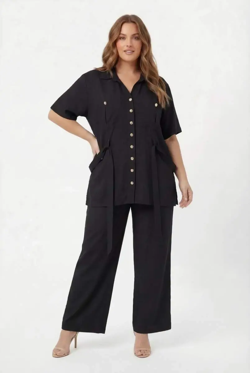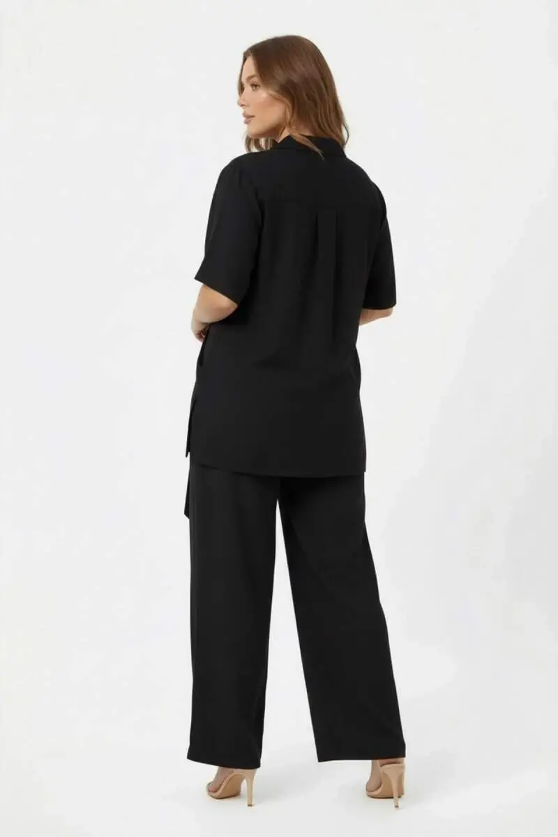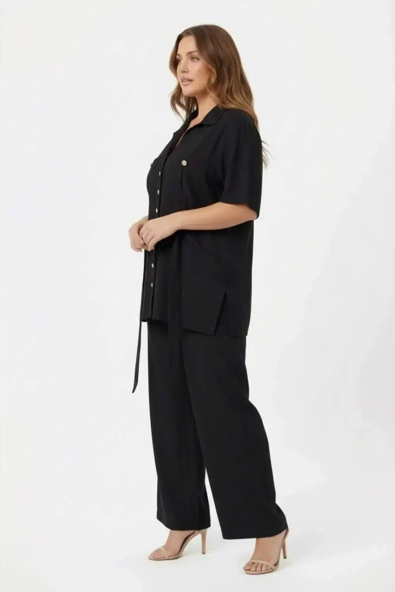 Bel Bağcık Detaylı Kadın Büyük Beden Ceket Pantolon İkili Takım Siyah