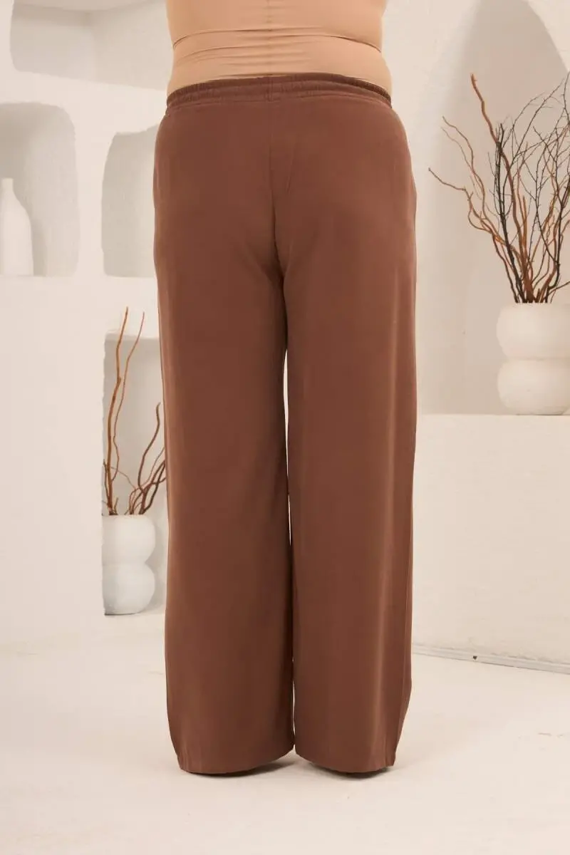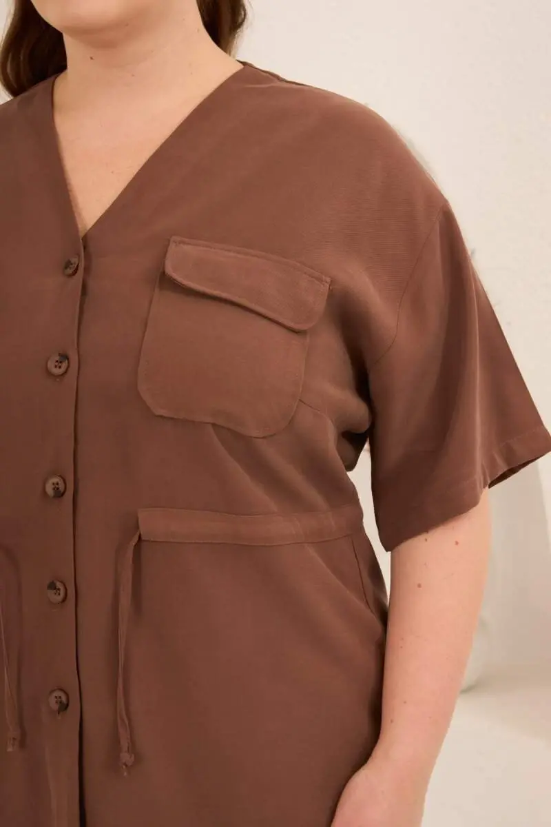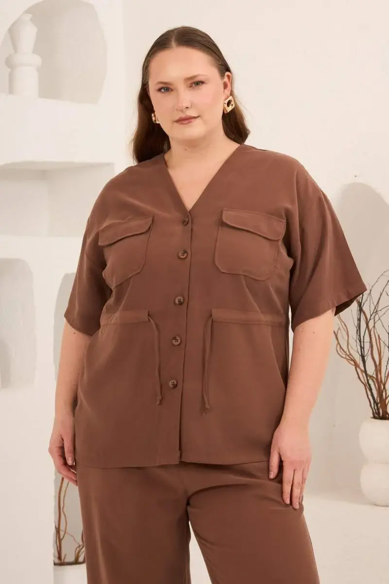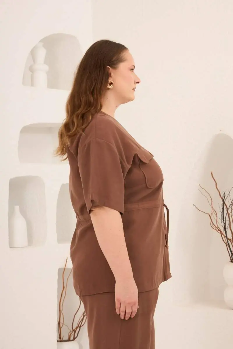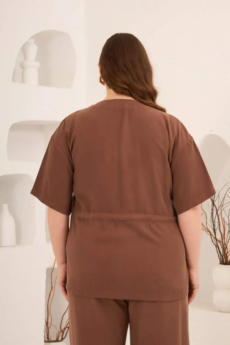 Bel Bağcık Detaylı V Yaka Kadın Büyük Beden Ceket Pantolon Takım Kahve
