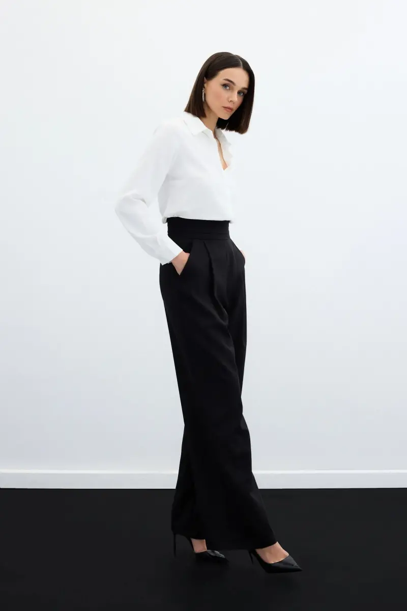 Bel detaylı pantolon, yüksek bel pantolon, cepli pantolon, siyah pantolon, rahat kesim pantolon, esnek kumaş pantolon, kadın pantolon, şık pantolon, günlük pantolon, modern pantolon