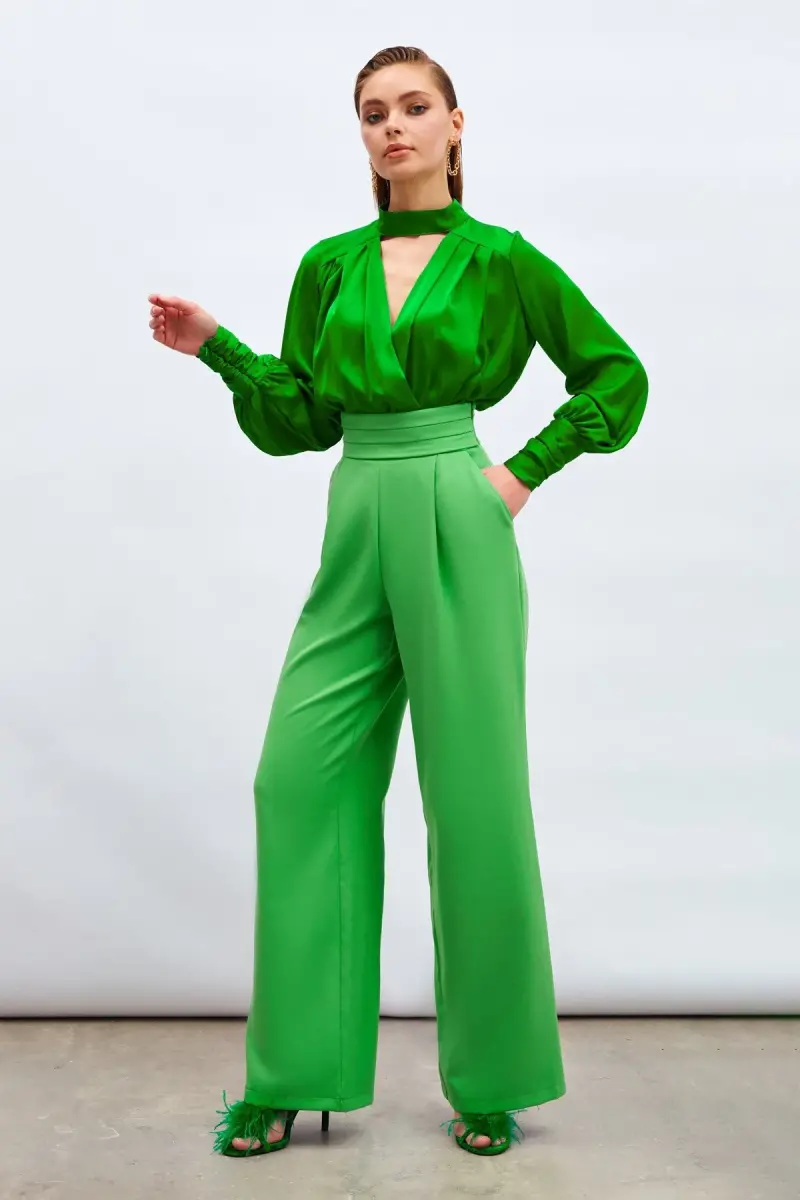 bel detaylı pantolon, yeşil pantolon, kadın pantolon, geniş cepli pantolon, şık pantolon, rahat pantolon, günlük pantolon