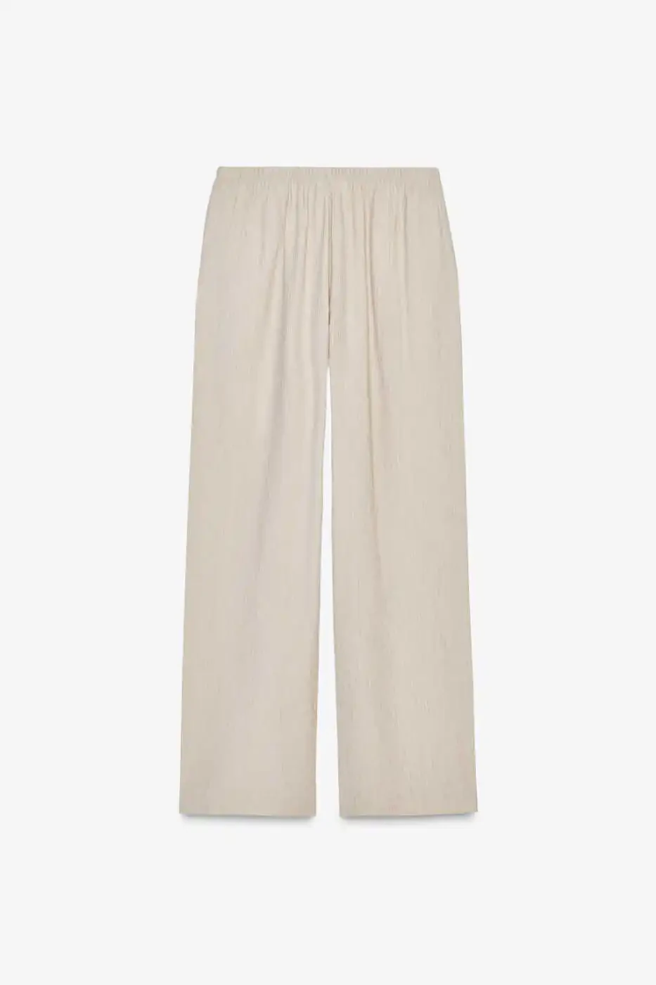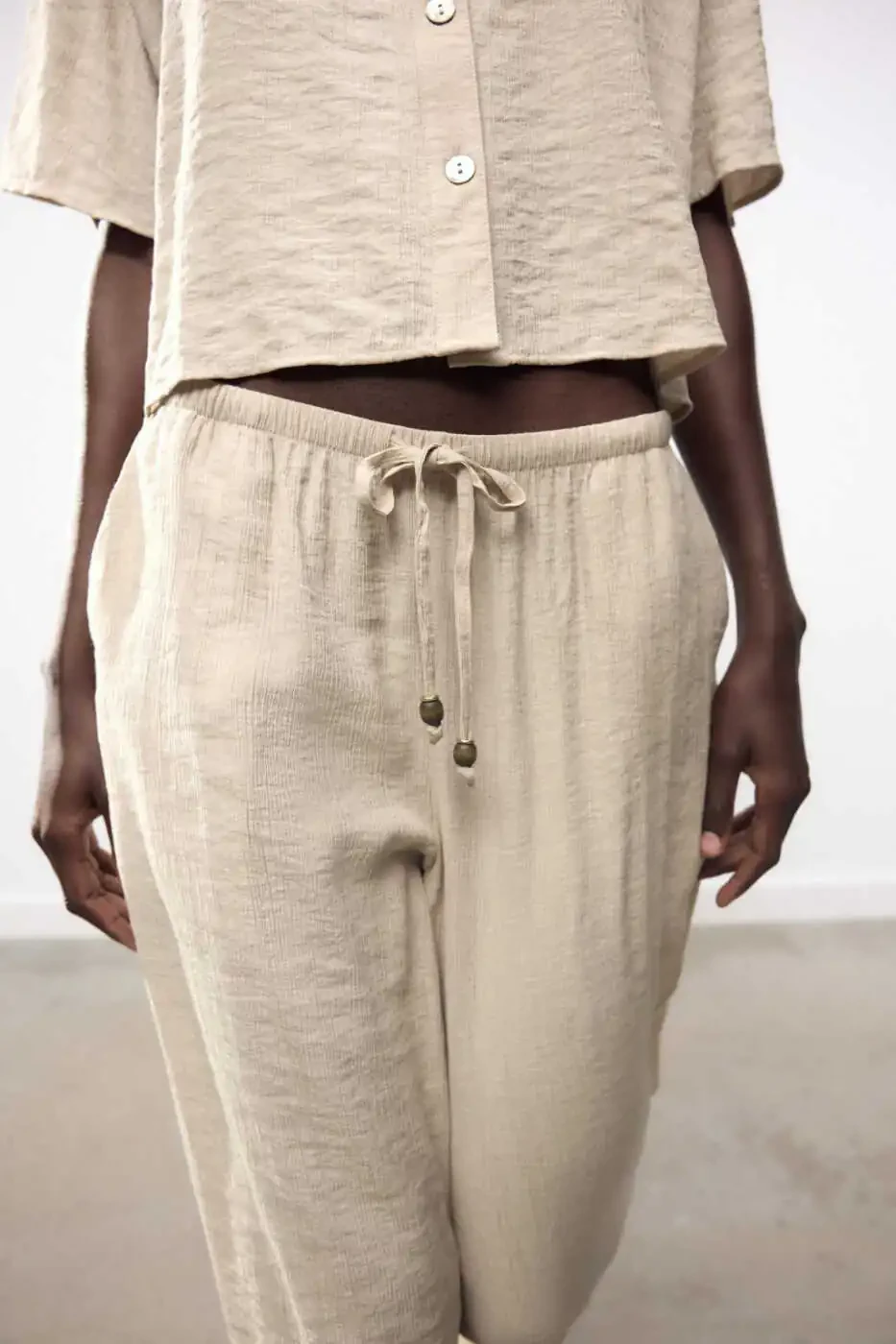 BEL ELASTIK KENG POCHA PANTOLON - Qum rangi, shkafingizning ajralmas qismiga aylanishga nomzod, ham zamonaviy, ham qulay variant. Ushbu shim zamonaviy ayolning dinamik turmush tarziga moslash uchun mo'ljallangan. Kundalik foydalanishda qulaylikni birinchi o'ringa qo'ygan holda, u maxsus tadbirlarda sizning uslubingizni to'ldiradigan mahsulot sifatida ajralib turadi. Qum rangining iliq va tabiiy ohangi har qanday kombinatsiya bilan osongina moslashadi va sizga cheksiz uslub imkoniyatlarini taqdim etadi.Shimning eng diqqatga sazovor xususiyatlaridan biri bu burmali ip bilan sozlanishi elastik baland belidir. Ushbu xususiyat shimning belingizga mukammal tarzda mos kelishini ta'minlaydi va kun bo'yi qulay foydalanish tajribasini taqdim etadi. Ipli sozlash mexanizmi yordamida siz belingizni xohlagan mahkamlik darajasida sozlashingiz mumkin, shunda harakat erkinligingizni cheklamagan holda zamonaviy ko'rinishga erishasiz. Yuqori bel kesimi tana chiziqlaringizni nafis tarzda ta'kidlaydi va uzunroq siluet yaratadi.Old cho'ntakli dizayn shimga ham funksionallik, ham zamonaviy muhit qo'shadi. Cho'ntaklar kichik narsalaringizni (telefon, kalit, karta va hokazo) xavfsiz tashish imkonini beradi va amaliy foydalanishni ta'minlaydi. Cho'ntaklarning joylashuvi va o'lchami shimning umumiy estetikasini buzmasdan, foydaliligini oshirish uchun ehtiyotkorlik bilan ishlab chiqilgan.Keng pocha kesimi BEL ELASTIK KENG POCHA PANTOLONning eng aniq xususiyatlaridan biridir. Keng pocha retros uslubning zamonaviy talqini sifatida namoyon bo'ladi va har bir qadamda o'zingizni erkin his qilishingizga imkon beradi. Ushbu kesim ham qulay foydalanishni ta'minlaydi, ham oyoqlaringizni uzunroq ko'rsatadi. Keng pocha harakatda nafis ravonlikni yaratadi va uslubingizga nafis teginish qo'shadi.BEL ELASTIK KENG POCHA PANTOLON - Qum yuqori sifatli matosi tufayli uzoq umr ko'rishni taklif etadi. Matoning tuzilishi teringizda yoqimli tuyg'u qoldiradi va kun bo'yi qulay bo'lishingizni ta'minlaydi. Shimning tikuvlari ehtiyotkorlik bilan qilingan va chidamliligi oshirilgan. Shu tarzda, siz shimingizdan ko'p yillar davomida ishonch bilan foydalanishingiz mumkin.Kundalik kombinatsiya uchun sport futbolka va krossovkalar bilanmi yoki maxsus tadbirda zamonaviy bluzka va poshnali tufli bilanmi, BEL ELASTIK KENG POCHA PANTOLON - Qum har qanday vaziyatda sizga hamroh bo'ladi va uslubingizni to'ldiradi. Ushbu shim shkafingizdagi boshqa buyumlar bilan osongina birlashtirilishi mumkin va turli xil uslublarni yaratishga imkon beradi.BEL ELASTIK KENG POCHA PANTOLON - Qum shunchaki shim emas, balki hayot tarzi hamdir. Qulaylik, nafislik va funksionallikni birlashtirgan ushbu shim zamonaviy ayolning ehtiyojlariga javob beradi va har doim eng yaxshi ko'rinishingizni ta'minlaydi.