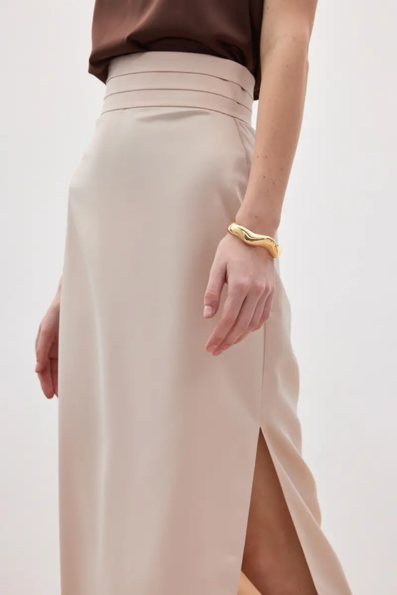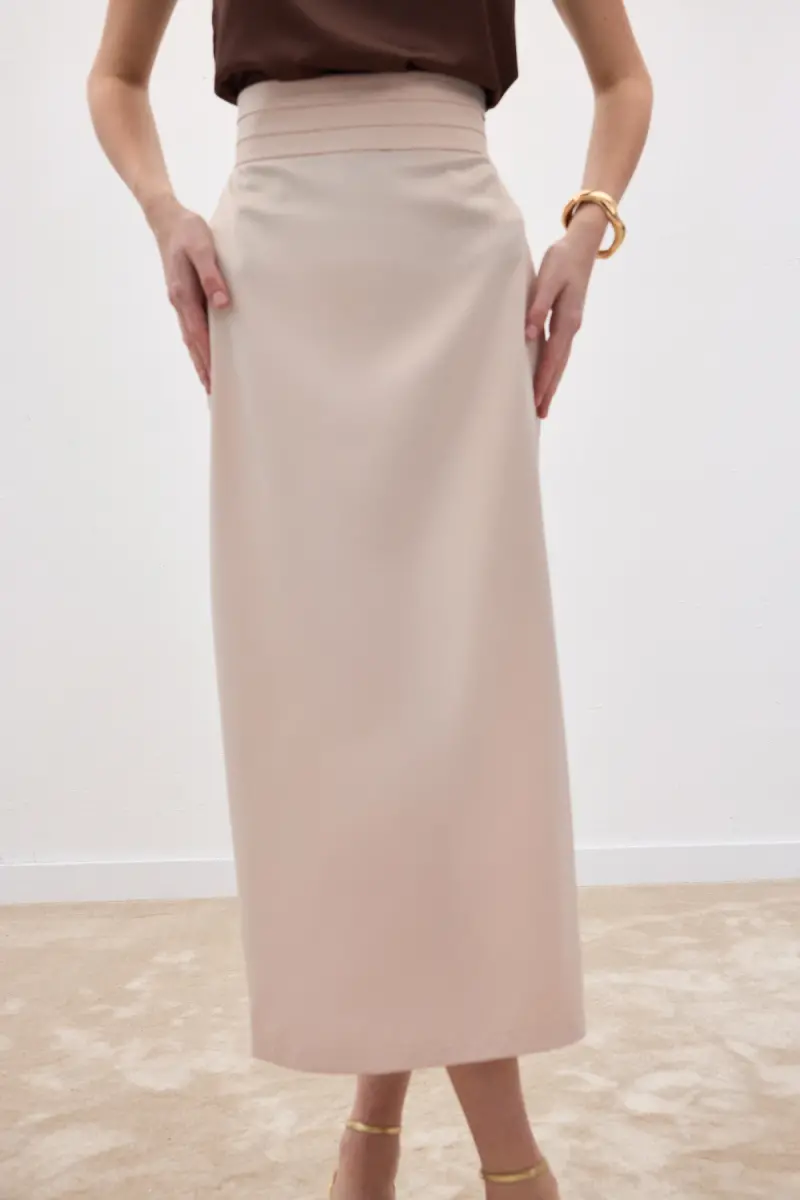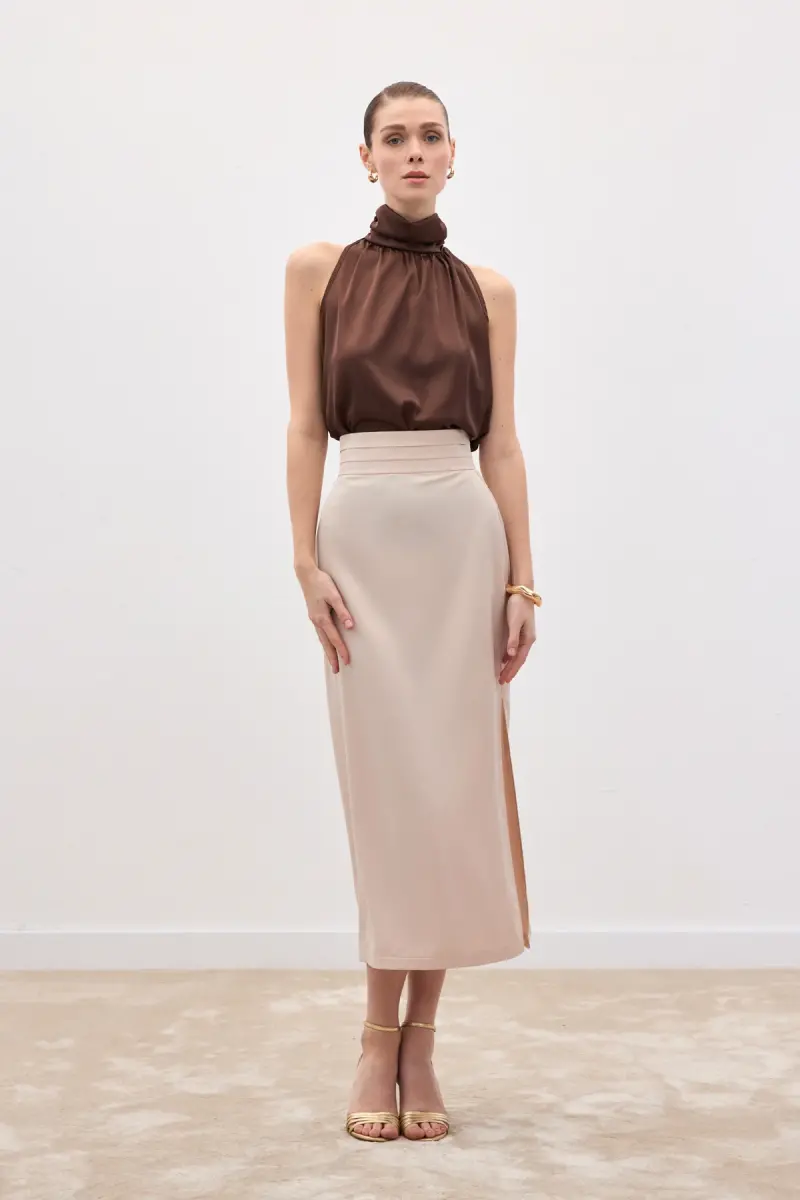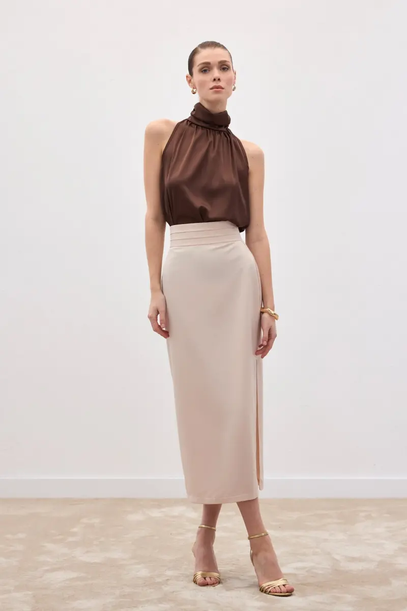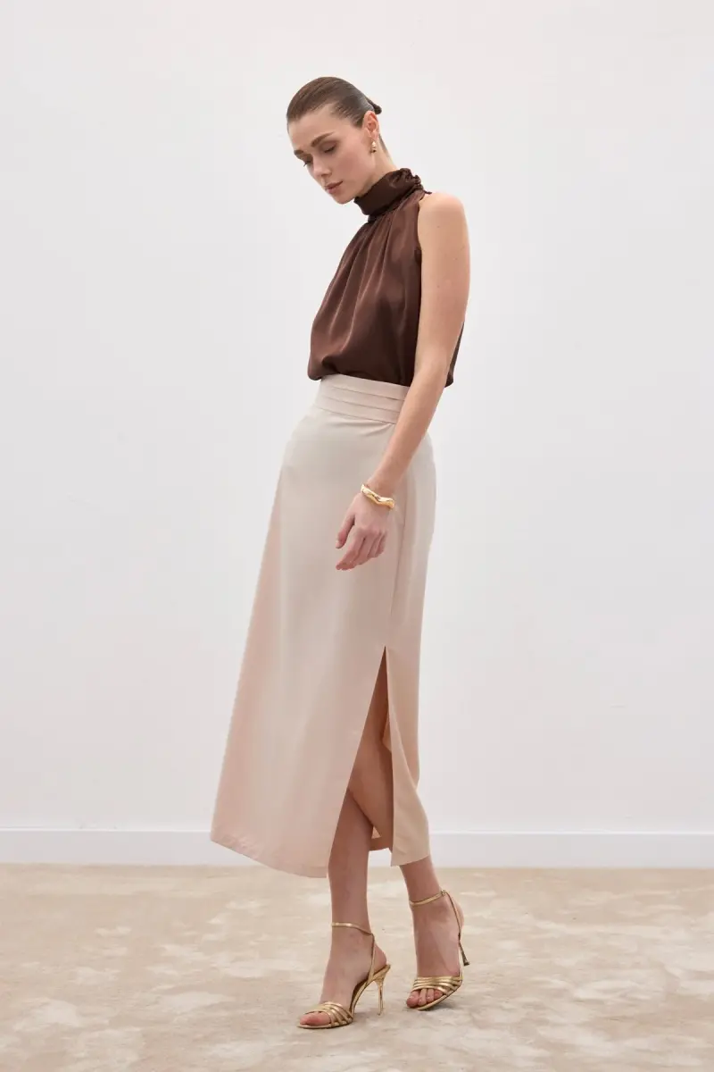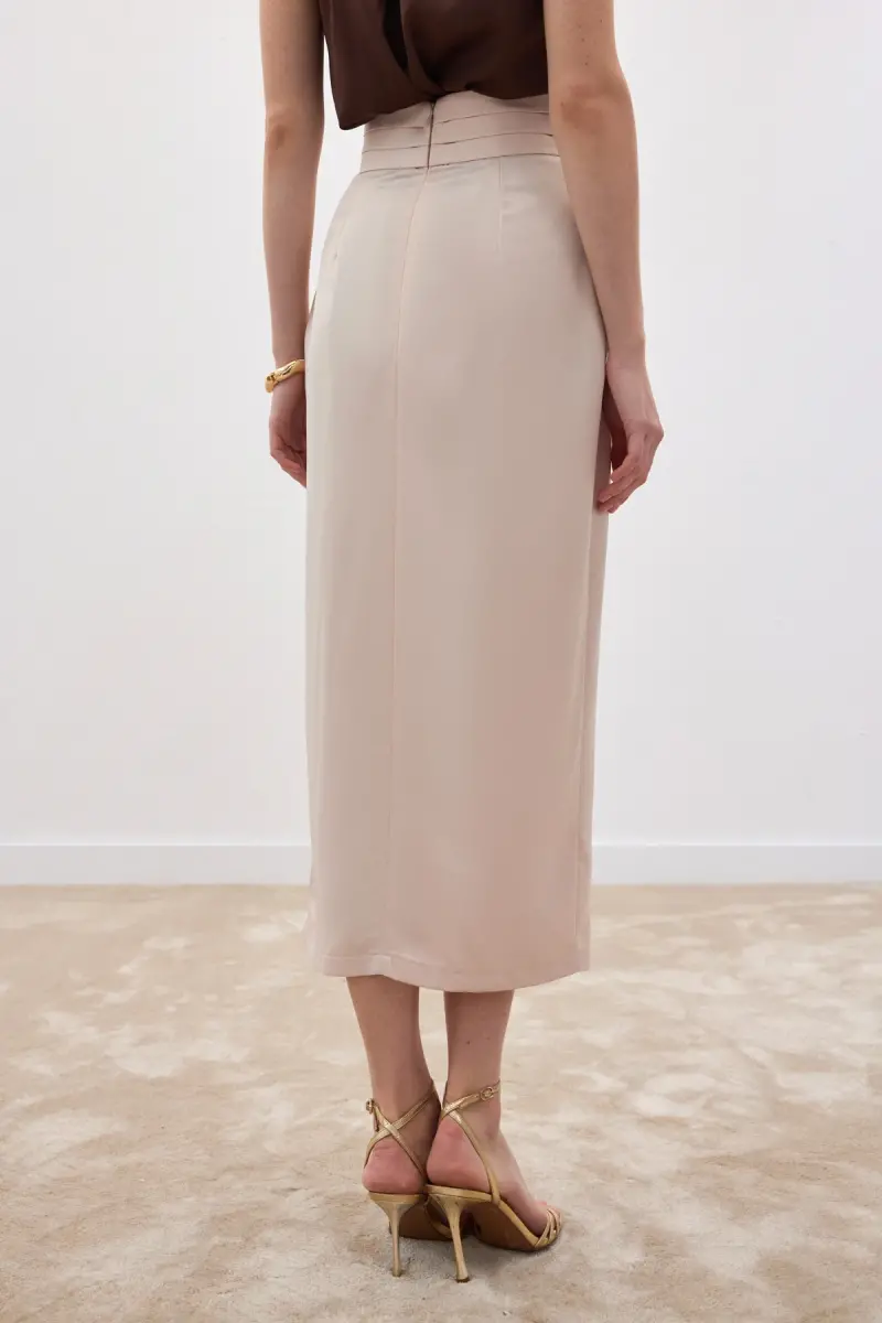 Bel Pile Detaylı Saten Etek - Bej-Bej