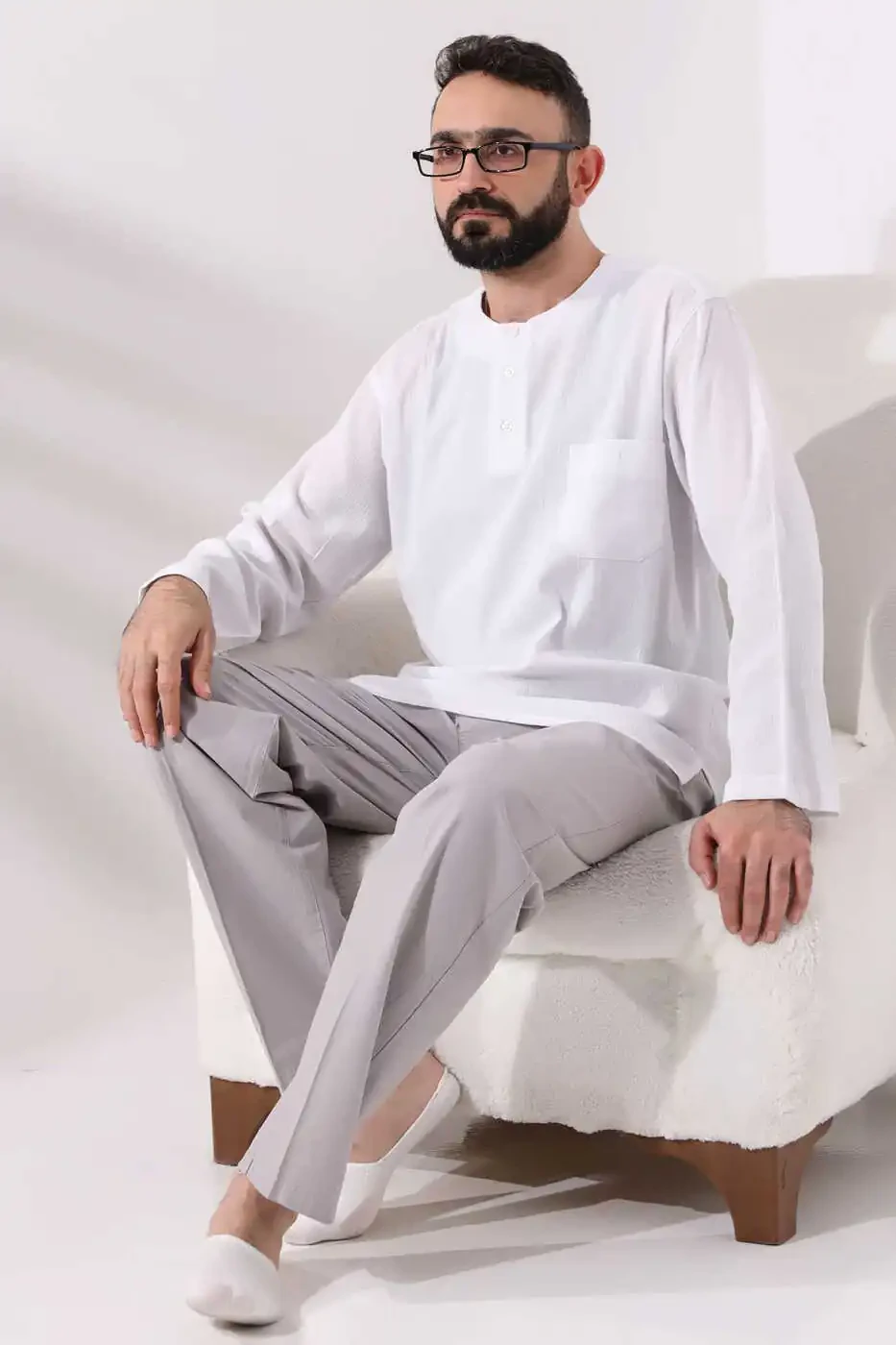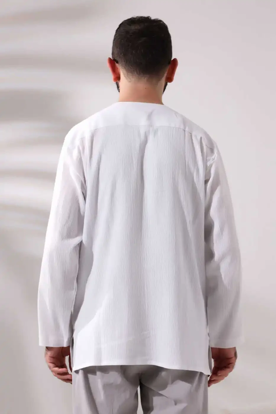 Эта белая мужская рубашка из шиле с расслабленной посадкой, нулевым воротником и 3 пуговицами обеспечит вам комфорт и стиль как во время паломничества хадж или умра, так и в повседневной жизни. Эта рубашка, изготовленная из 100% хлопковой ткани шиле, идеально подходит для лета, имеет свободный крой и прямые рукава. Ее охлаждающие и влагоотводящие свойства обеспечивают комфорт в течение всего дня. Дизайн с тремя пуговицами сочетает в себе стиль и простоту использования, а крой, не прилегающий к телу, гарантирует, что вы будете чувствовать себя комфортно в любой момент. Она обеспечивает удобную посадку как для паломничества хадж и умра, так и для повседневной жизни.