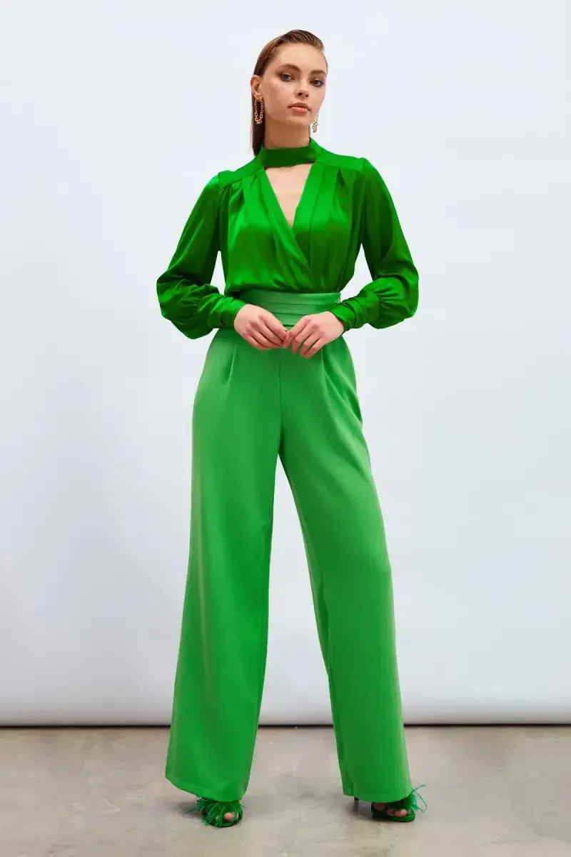 bel detalli shim, yashil shim, ayollar shimi, keng cho'ntakli shim, uslubli shim, qulay shim, kundalik shim