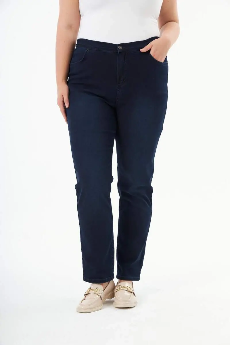 Beli Lastikli Büyük Beden Koyu Lacivert Kot Pantolon